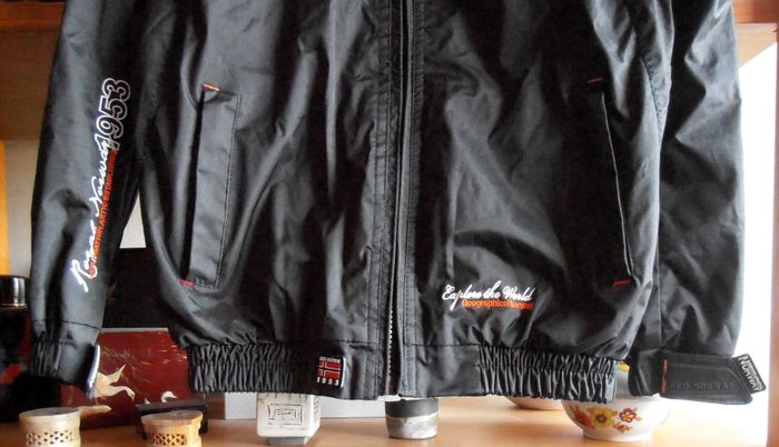 Manteau à capuche enfant, parka, Geographical Norway, taille : 8 ans, couleur noir, rouge et blanc avec motifs de logos, drapeaux etc... Capuche, manches longues, fermeture éclair, deux poches avant et quatre à l'intérieur, imperméable. Très bon état. Parfait pour protéger du froid et de la pluie !