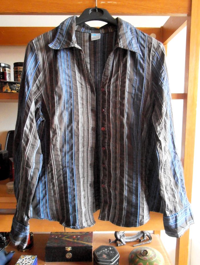 Chemise femme, marque M&S Mode, collection Best basics, taille 42 XL, couleur noire, bleue et gris à rayures verticales, 69 % de coton, manches longues, col en V, cintrée, boutons (+ un de rechange). Très bon état. Bien en toutes saisons. Look féminin et casual !