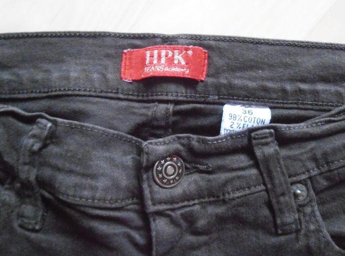 Jeans femme, coupe skinny, marque : HPK, taille 36 S, couleur marron foncé, avec un joli motif de cerises en strass brillants sur la poche droite arrière, matière : 98% coton, mesures à plat : longueur 104 cm, largueur 29 cm, fermeture : bouton métal et braguette, 3 poches avant, 2 poches arrière, possibilité de passer une ceinture. Très bon état. Un jeans féminin et confortable !