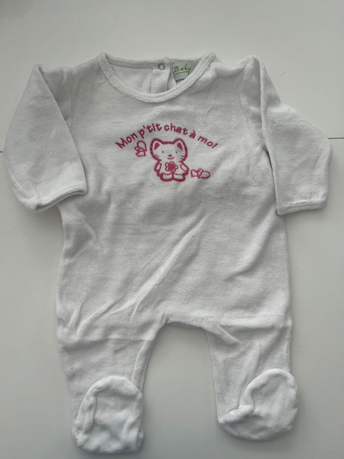 Lot de 3 pyjamas pour bébé fille, taille 6/9 mois, tout doux et adorables. • 1 pyjama blanc avec petit chat et inscription “Mon p’tit chat à moi”. • 1 pyjama blanc avec petits oiseaux et col rose. • 1 pyjama rose avec étoiles rouges et violettes. Matière velours, pressions sur le devant et à l’entrejambe pour un habillage facile. État : Très bon état, aucun défaut visible. Taille : 6/9 mois Prix : 12 € le lot