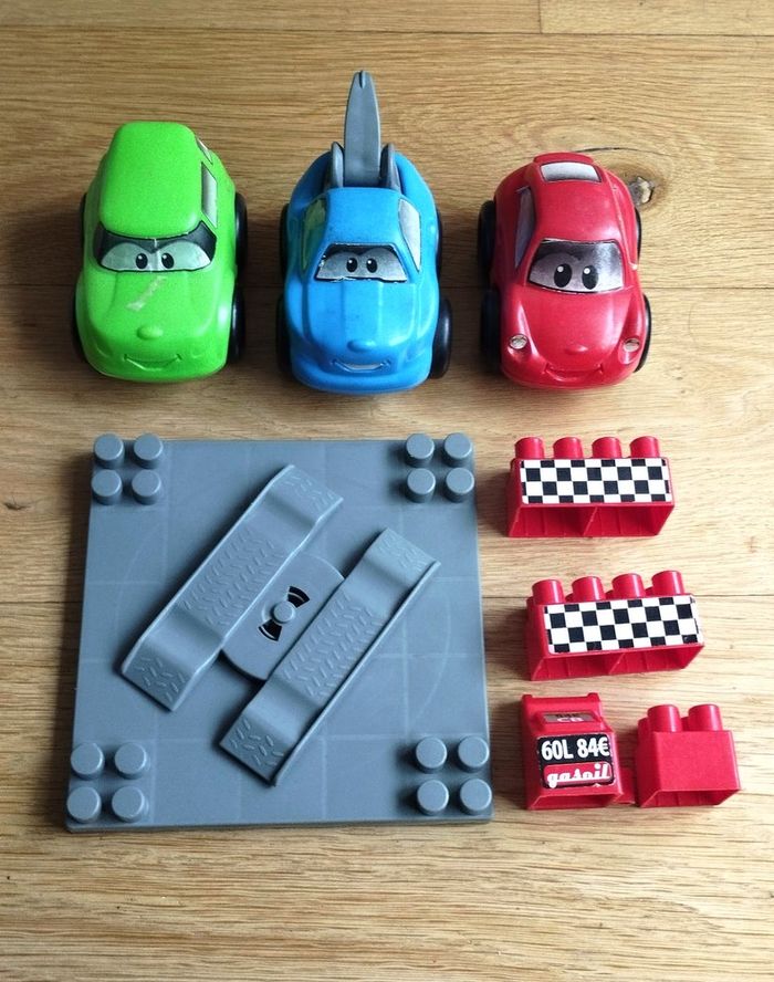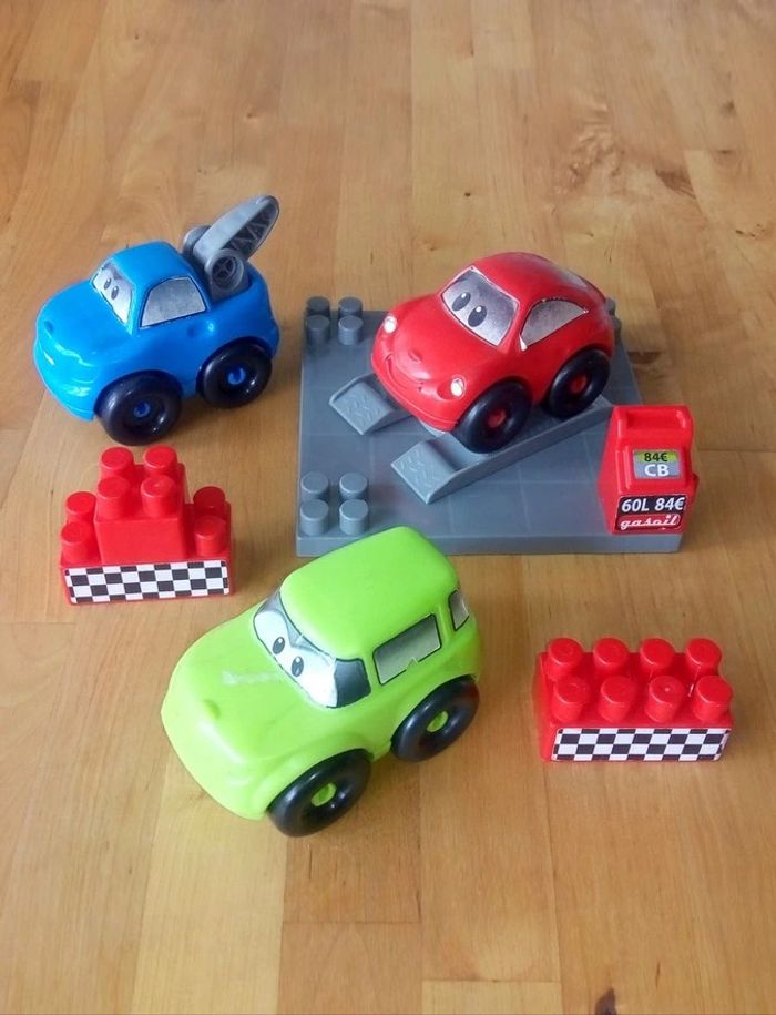 Lot de voitures et accessoires de marque Abrick (le Lego à la française par Ecoiffier) pour enfant dès 18 mois 3 voitures + plateforme pivotante + briques Trace d'usure, stickers abimés
