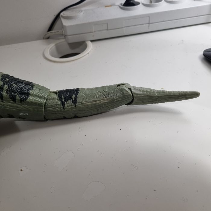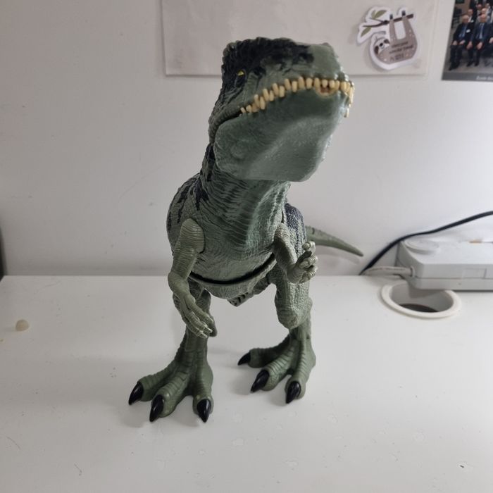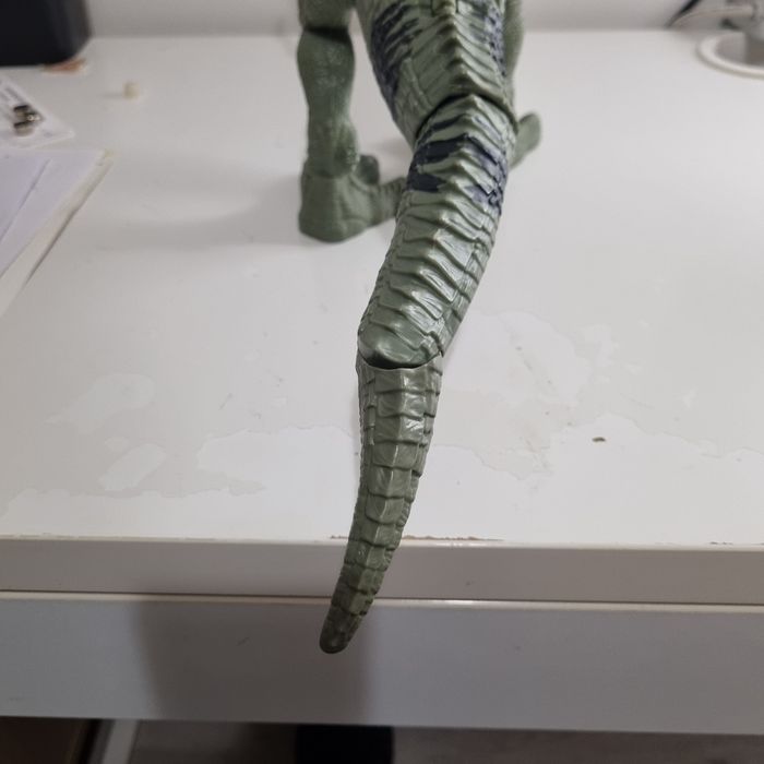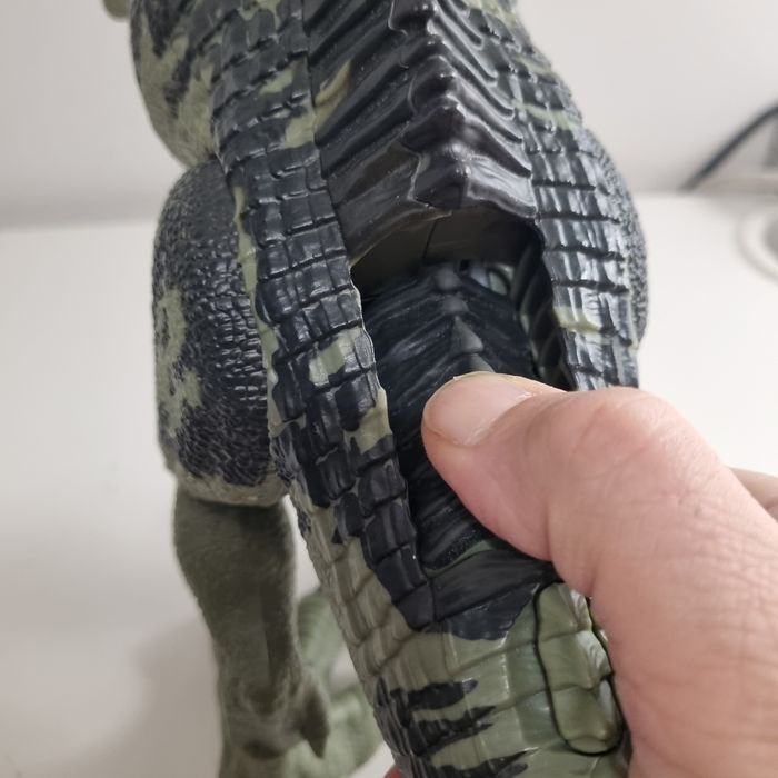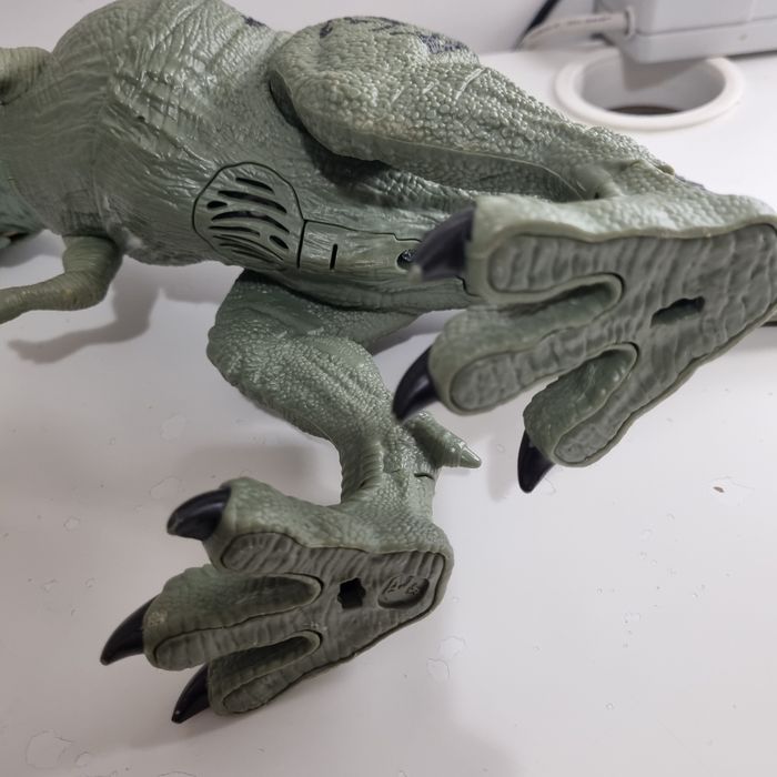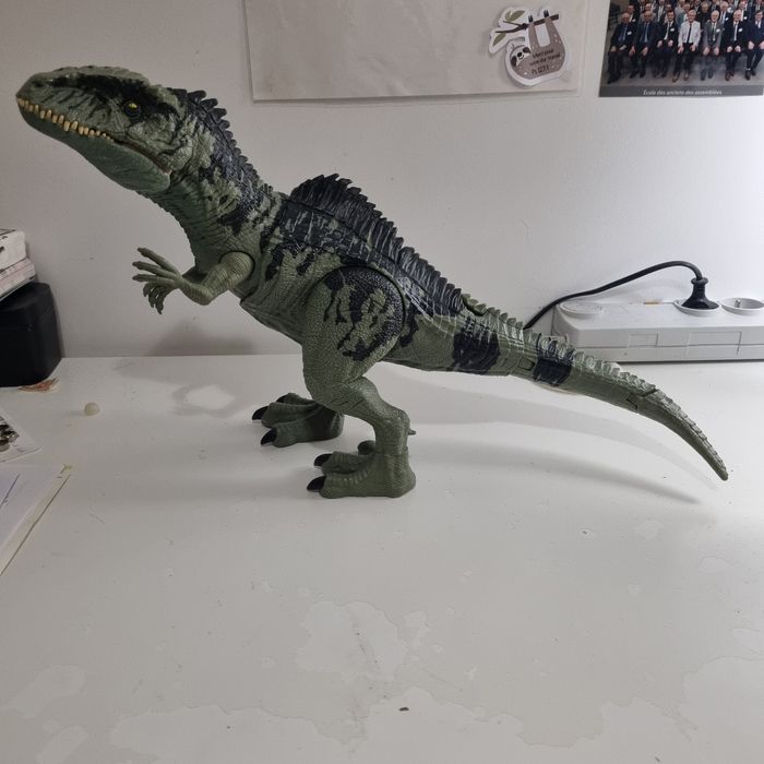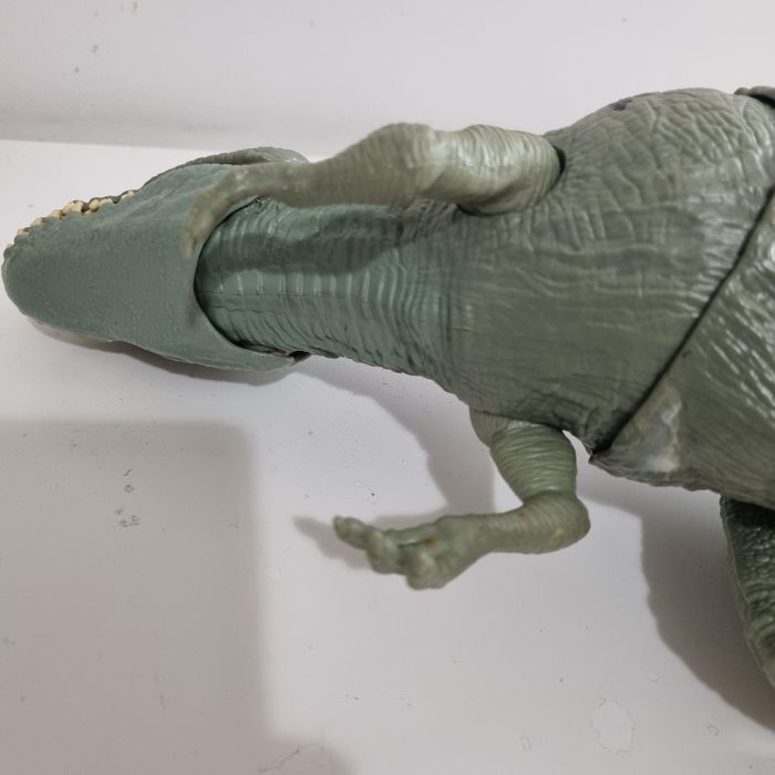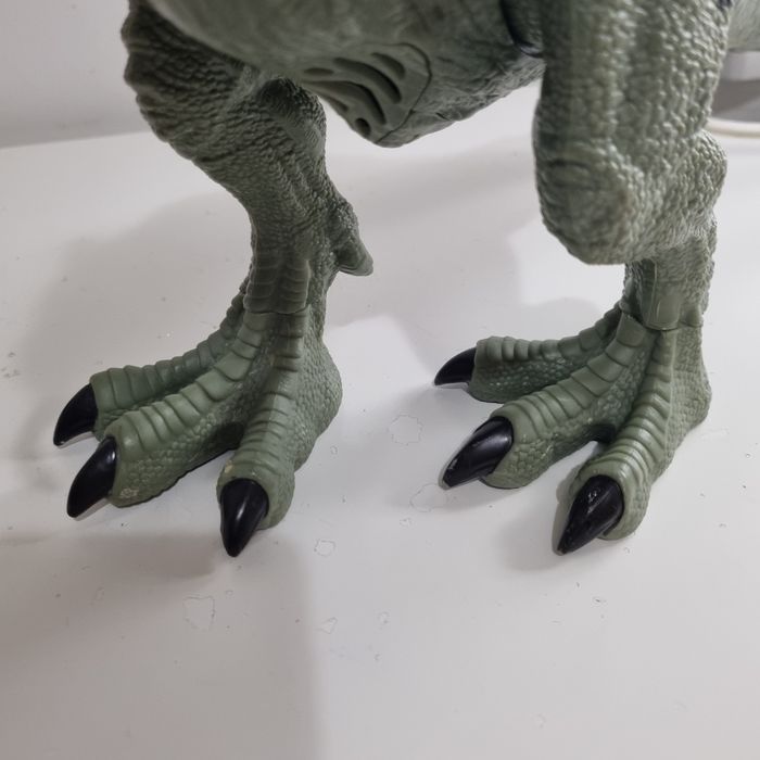 Dinosaure articulé et sonore. Dimensions d'environ 30 cm de hauteur et plus de 50 cm de long. 3 piles LR44. Petite tâche sur le ventre ( voir photo)
