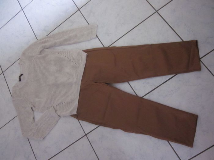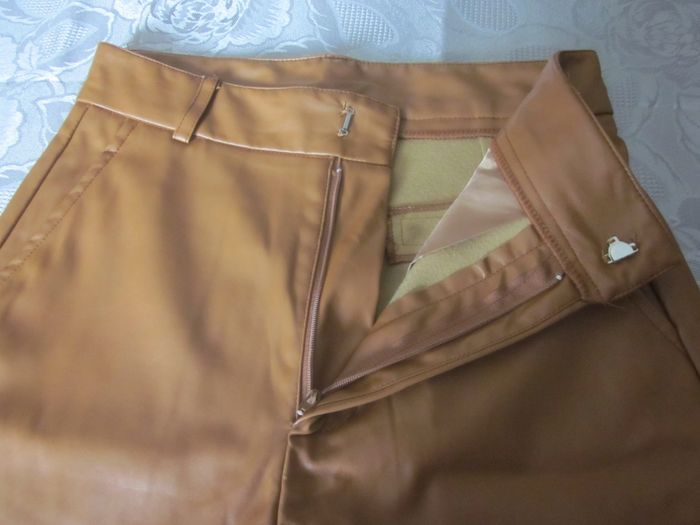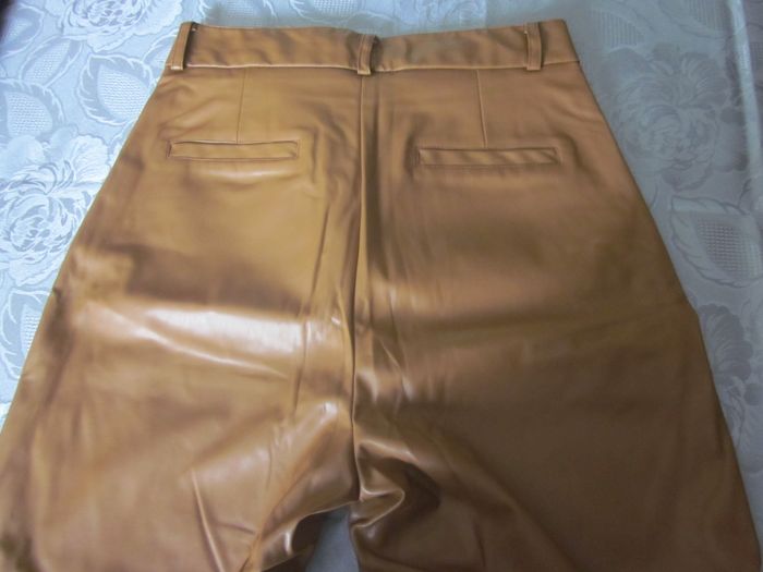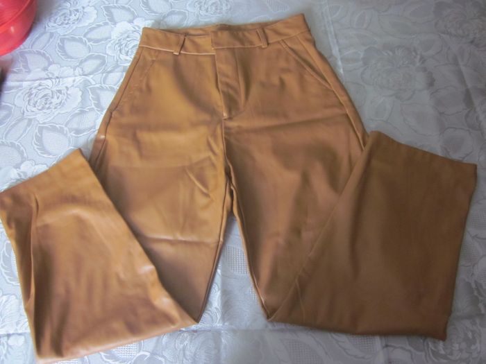 M, pantalon imitation cuir, taille haute, 2 fausses poches arrière, 2 poches biais, neuf (quelques mesures à plat : taille 36cm, hauteur totale 96 cm, entrejambe 62cm, largeur bas 18cm)+ pull lamé doré cache cache