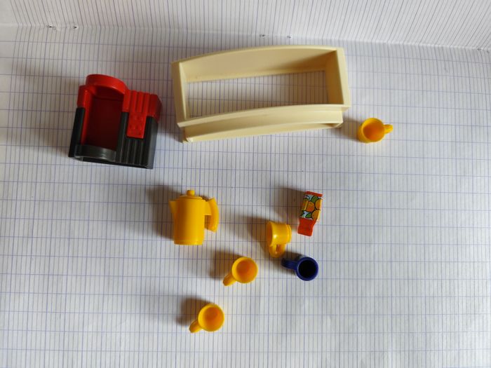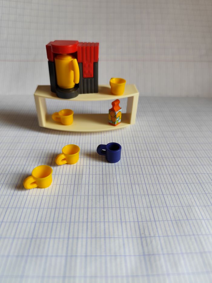 meuble avec cafetière, tasses, pichet et jus d'orange pour compléter maison ou école Playmobil comme sur la photo
