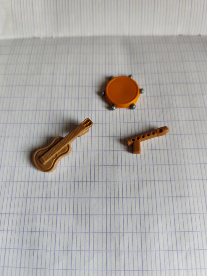 lot classe de musique comprenant trois accessoires *une guitare *une flûte *un tambourin Playmobil comme sur la photo