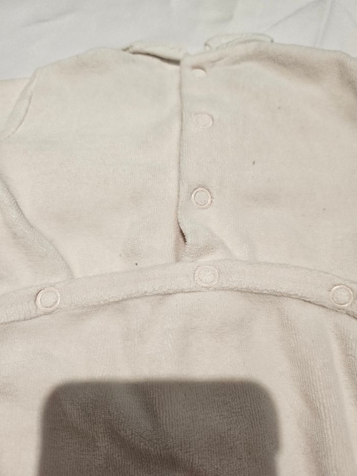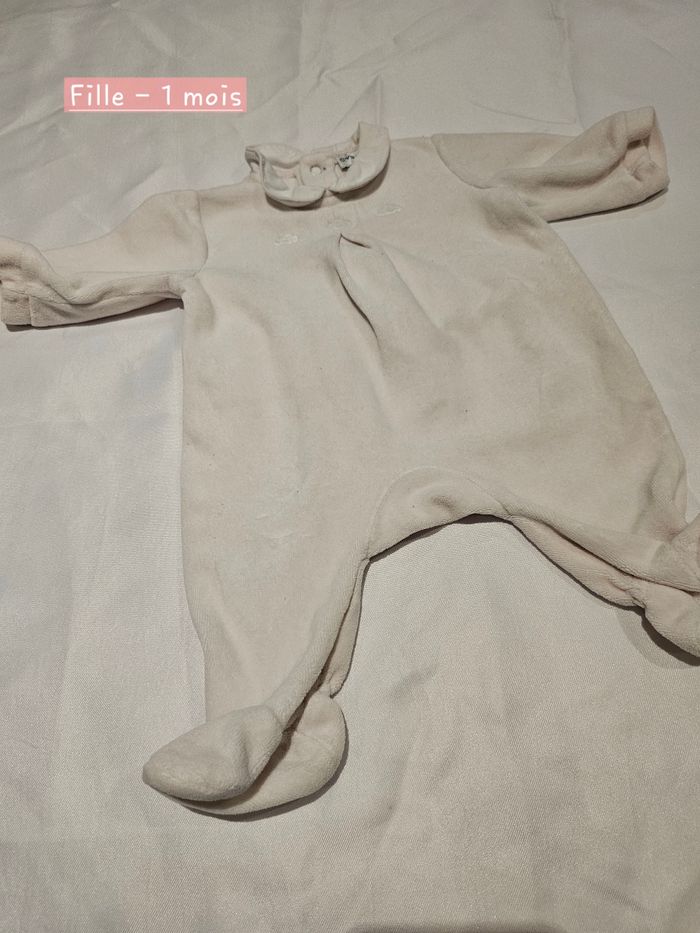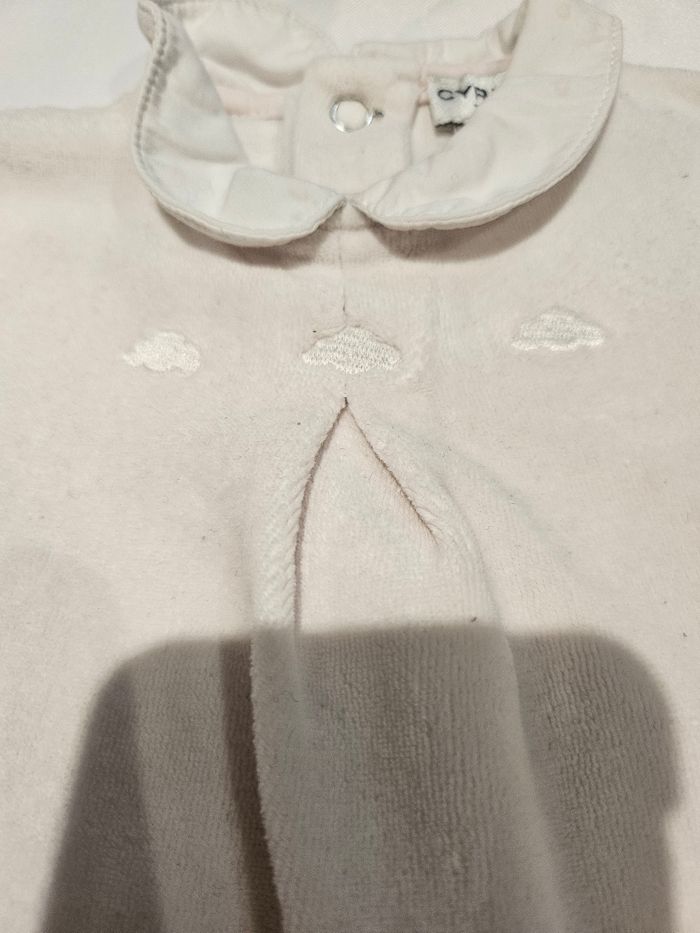 Pyjama en velours avec fermeture par pressions dans le dos. Rose pâle avec broderies nuage devant et col blanc. Marque : Cyrillus Taille : 1 mois