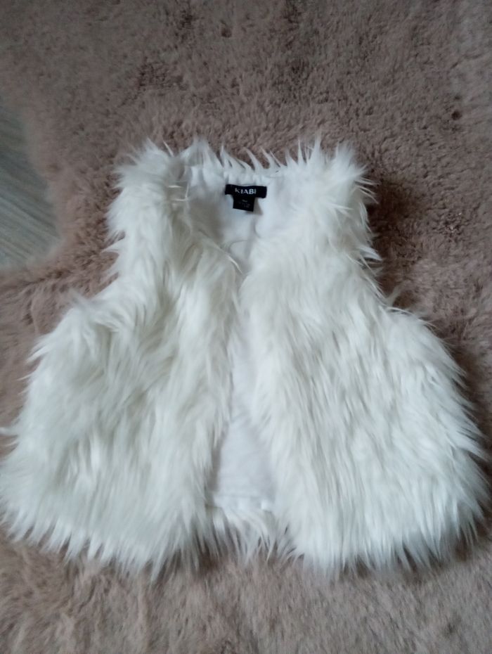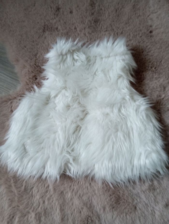 Gilet sans manches fausse fourrure, taille 3 mois, 56-62 cm, marque Kiabi. Peut se fermer grâce à un bouton.