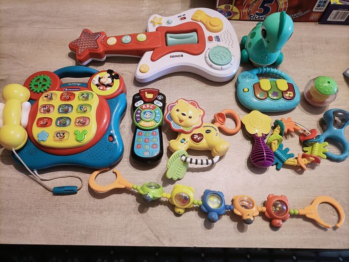 Lot de plusieurs jeux bon état de bébé et enfant. Il y a des traces d usures et un jouet cassé mais ne gêne pas l utilisation voir photo. Les jeux qui fonctionnent avec piles on fonctionné jusqu'à maintenant certains on encore des piles qui fonctionne.