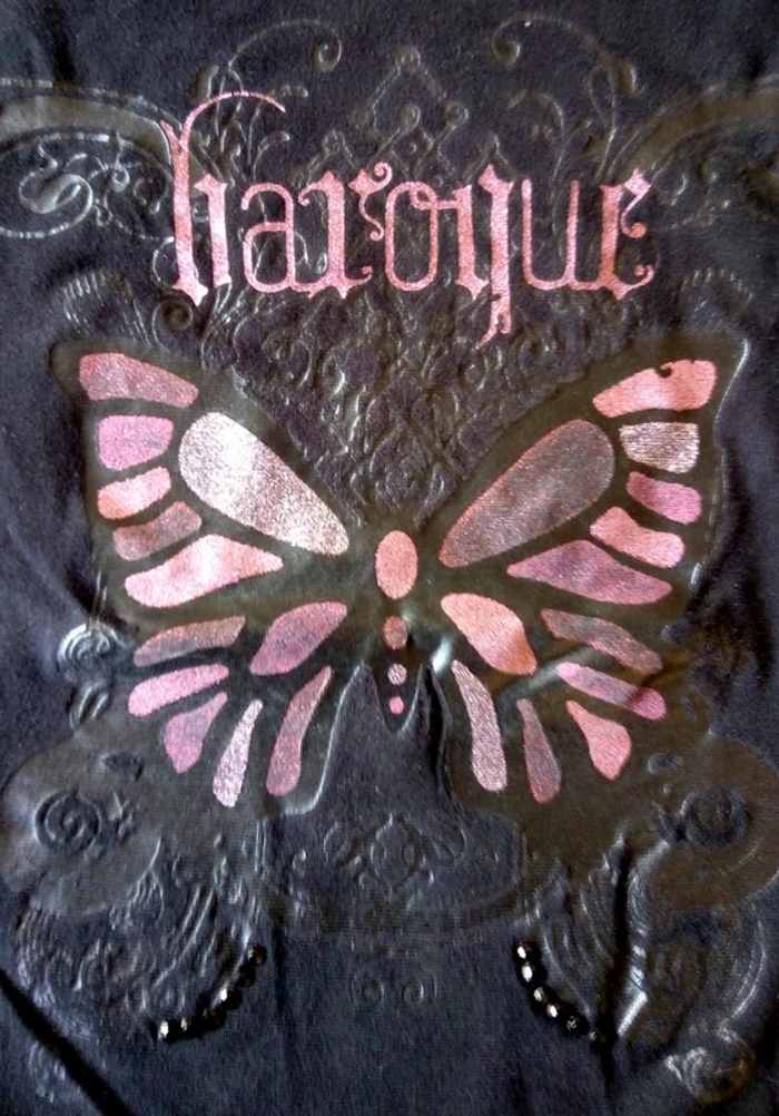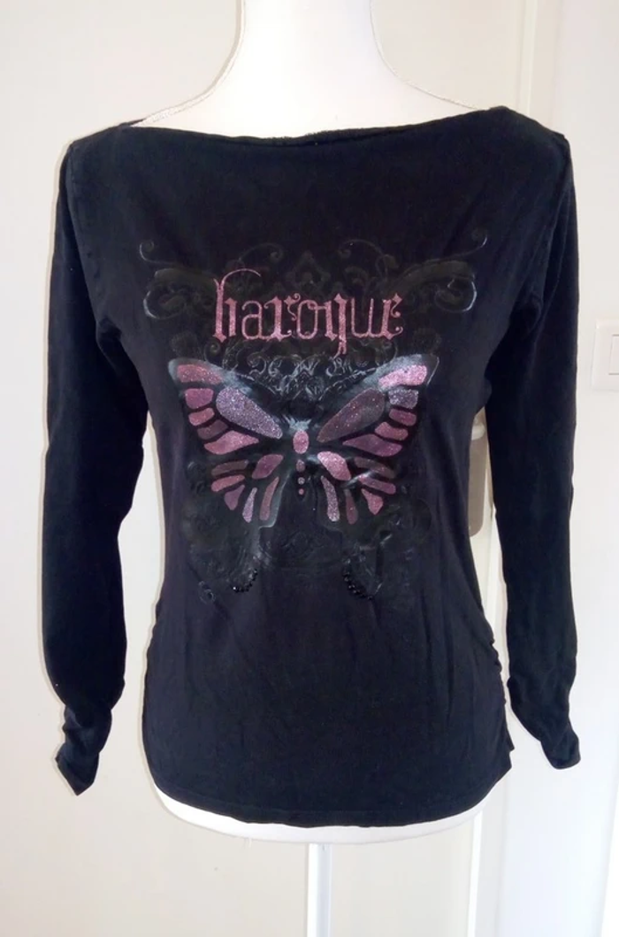 Top noir de marque Miss Cerise taille M col bateau, manches longues à poignets froncés Imprimé baroque arabesques papillon rose et noir pailleté, strass noirs