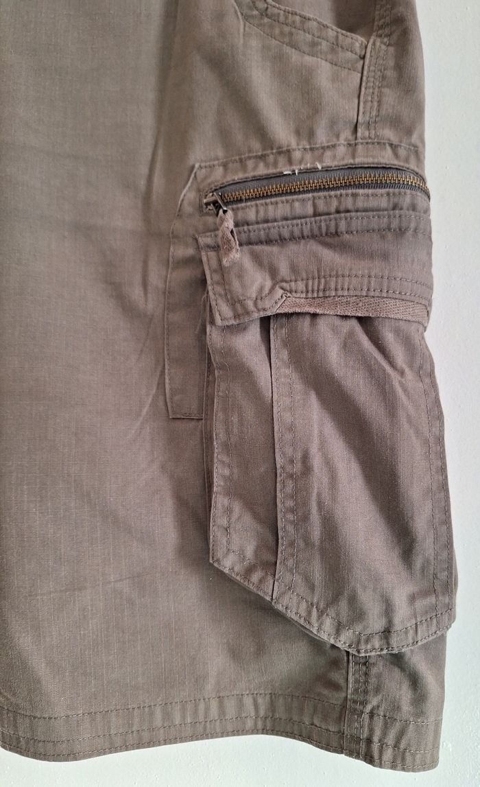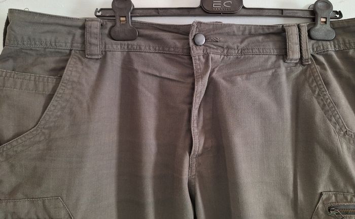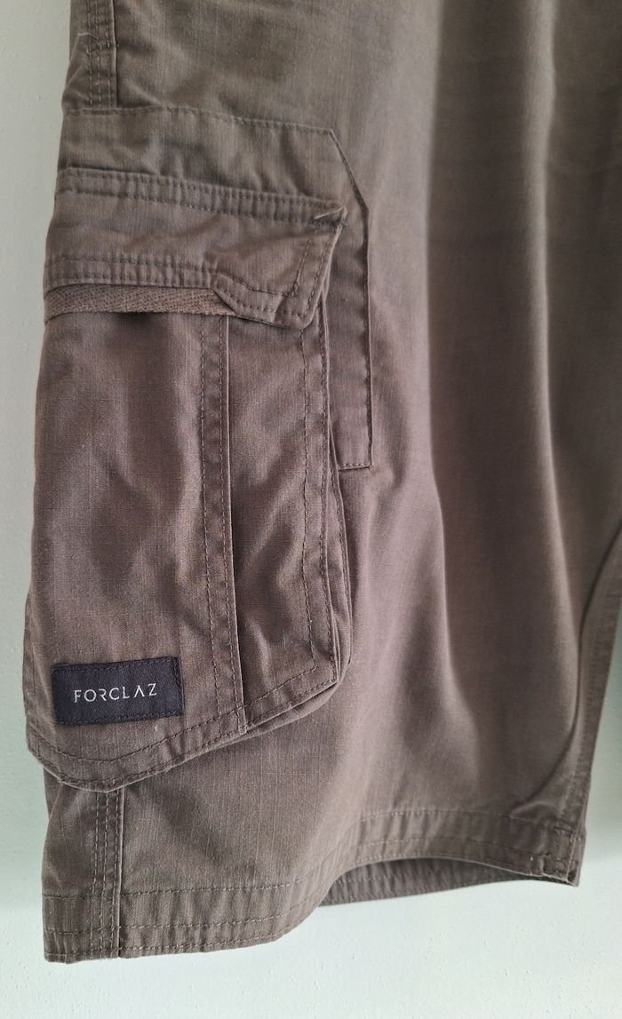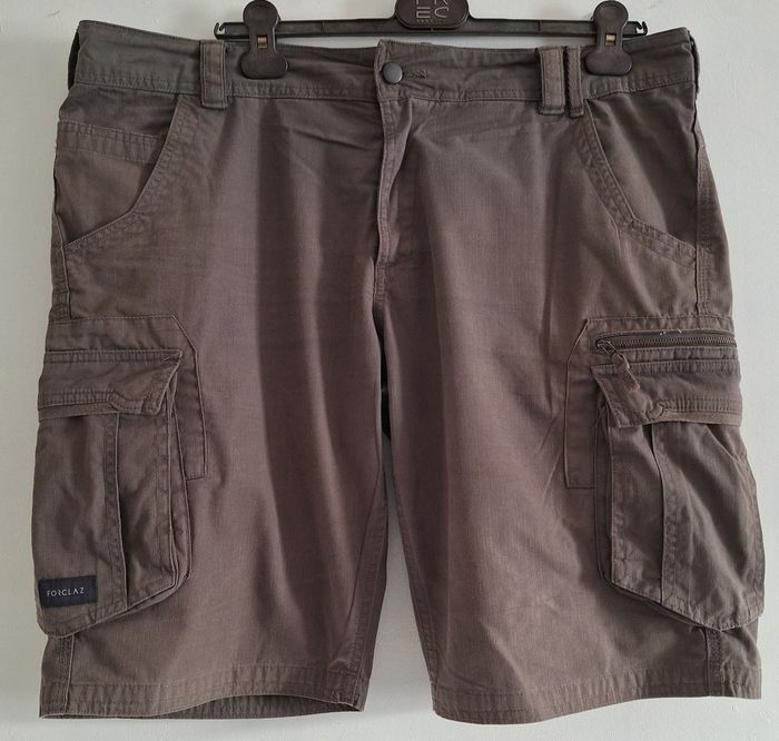 Bermuda fermé par bouton et zip. Passants pour ceinture. Deux poches devant et deux poches à pressions derrière. Une poche à pressions avec écusson Forclaz à la cuisse droite. Une poche zippée et une poche à pressions à la cuisse gauche. Taille 48 mais étiquette coupée car ça grattait.