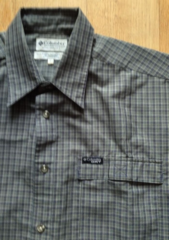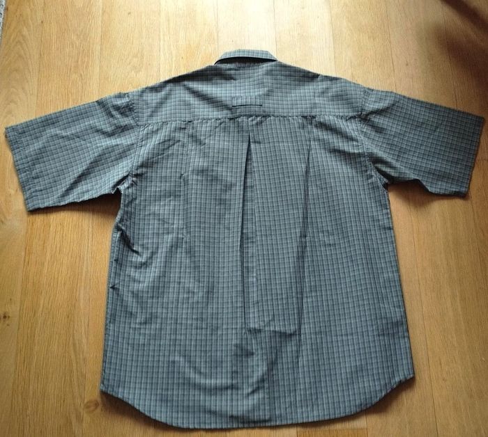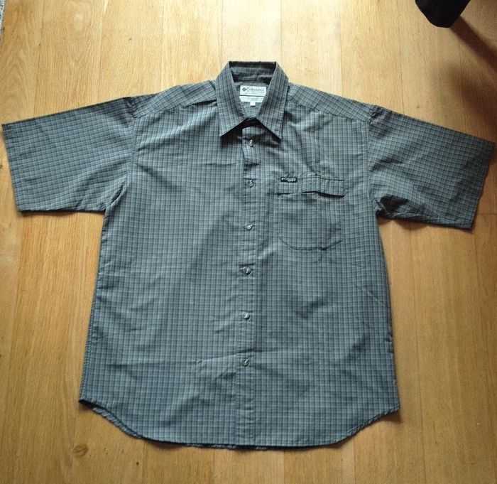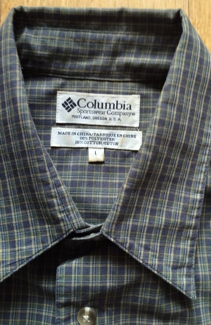 Chemisette de marque Columbia taille grand L (US) Coupe ample Textile polyester coton Motifs carreaux marine vert Poche poitrine à scratch Mesures épaules 56 cm / aisselles 64 cm