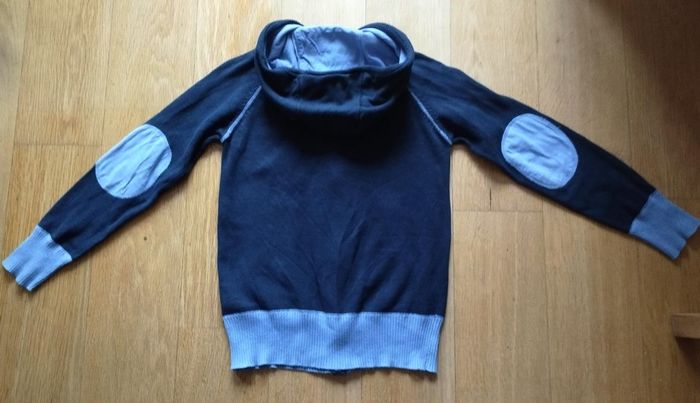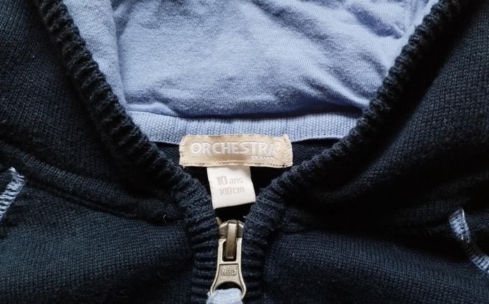 Gilet zippé de marque Orchestra taille 10 ans Textile maille coton Coloris marine détails contrastants bleu Lettrage Varsity 95 sport dept Capuche, coudières, poches