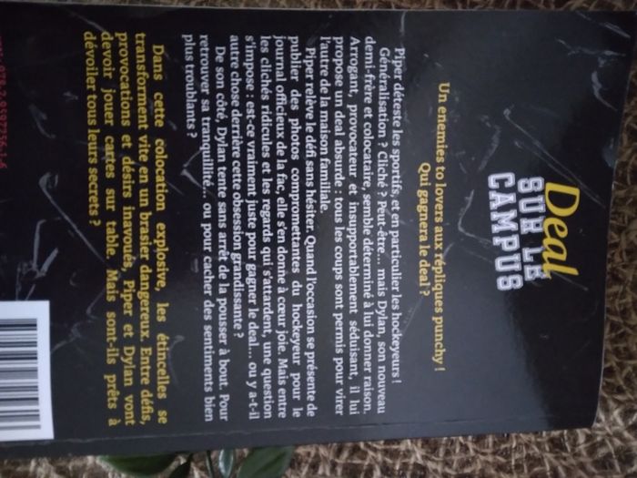 Livre romance deal sur le campus. Une colocation explosive Légèrement abîmé Auteur: Heather S.Wood Résumé: Un enemies to lovers aux répliques punchy ! Qui gagnera le deal ? Piper déteste les sportifs, et en particulier les hockeyeurs ! Généralisation ? Cliché ? Peut-être… mais Dylan, son nouveau demi-frère et colocataire, semble déterminé à lui donner raison. Arrogant, provocateur et insupportablement séduisant, il lui propose un deal absurde : tous les coups sont permis pour virer l’autre de la maison familiale. Piper relève le défi sans hésiter. Quand l’occasion se présente de publier des photos compromettantes du hockeyeur pour le journal officieux de la fac, elle s’en donne à cœur joie. Mais entre les clichés ridicules et les regards qui s’attardent, une question s’impose : est-ce vraiment juste pour gagner le deal… ou y a-t-il autre chose derrière cette obsession grandissante ? De son côté, Dylan tente sans arrêt de la pousser à bout. Pour retrouver sa tranquillité… ou pour cacher des sentiments bien plus troublants ? Dans cette colocation explosive, les étincelles se transforment vite en un brasier dangereux. Entre défis, provocations et désirs inavoués, Piper et Dylan vont devoir jouer cartes sur table. Mais sont-ils prêts à dévoiler tous leurs secrets ?