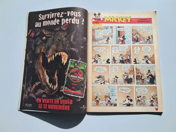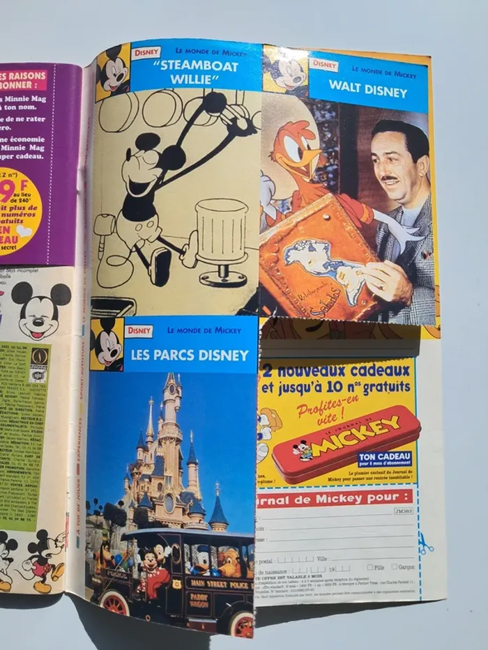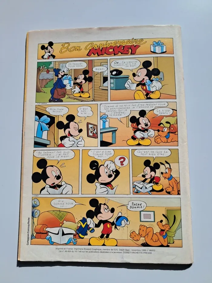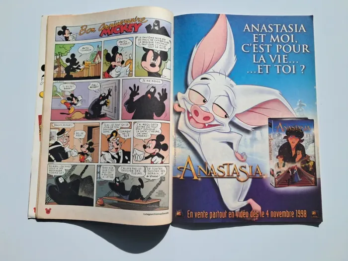 Le Journal de Mickey n°2421 - 70 Ans de Mickey du 10 novembre 1998. Dans le contenu, il y a uniquement des bandes dessinées de Mickey dans ce numéro : Mickey, Bon Anniversaire Mickey, L'Enigme de Mickey. On trouve au centre du journal un album souvenir de Mickey sur plusieurs pages (de 1928 à 1998). On y trouve des publicités vintage de l'époque : les cassettes vidéo de Jurassic Park : Le Monde Perdu, Anastasia (ainsi que le jeu PC sur CD-Rom), Minnie Mag, Vtech, Mulan, Disney Channel, le jeu de société Le Défi du Sphinx. Il y a les fameuses fiches présentes à la fin du magazine (une seule a déjà été découpée).
