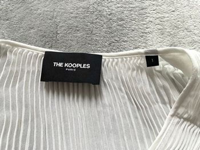 Magnifique chemisier The Kooples Paris dans un style chic et intemporel. 📏 Taille : 1 (correspond à un 36 / Taille S). 🎨 Couleur : Blanc / Blanc cassé lumineux. Détails Clés : • Matière : Soie légère • Design : Plissé intégral sophistiqué et coupe croisée (cache-cœur). • Style : Manches longues bouffantes, épaules froncées. ✅ Très bon état. - L'étiquette de composition intérieure a été proprement découpée pour plus de confort au porté. La fluidité et la douceur confirment toutefois qu'il s'agit bien de la qualité soie emblématique de la marque.