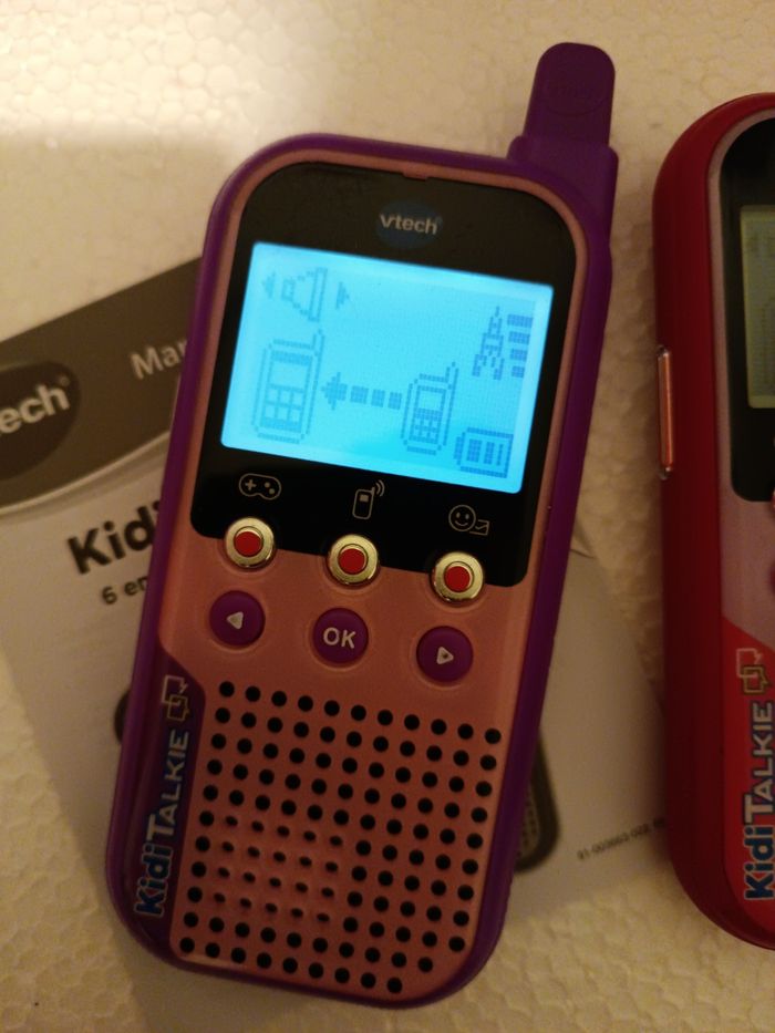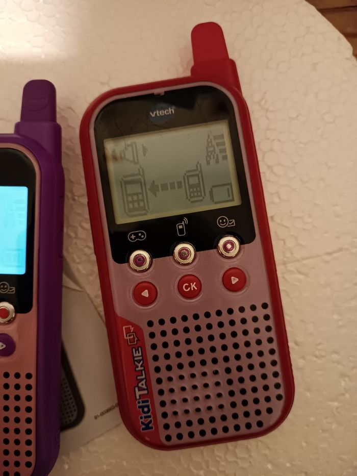 Très bon état Quelques légères griffes d'utilisation mais fonctionnent parfaitement. Vendus sans les piles. 3 piles AAA par talkie.
