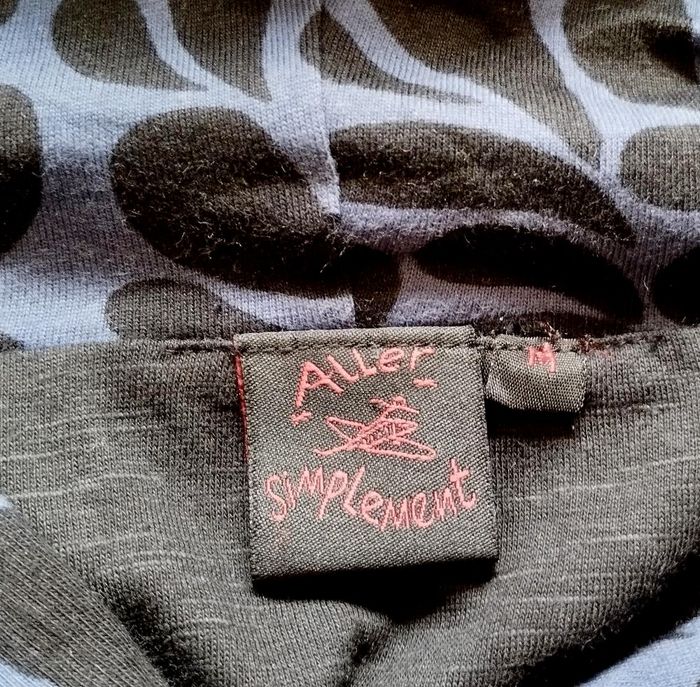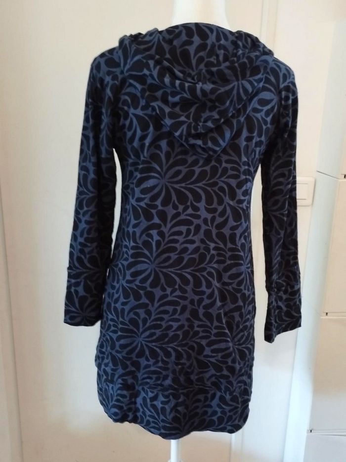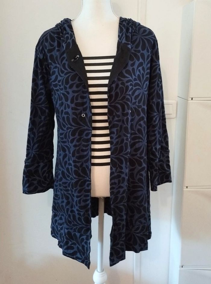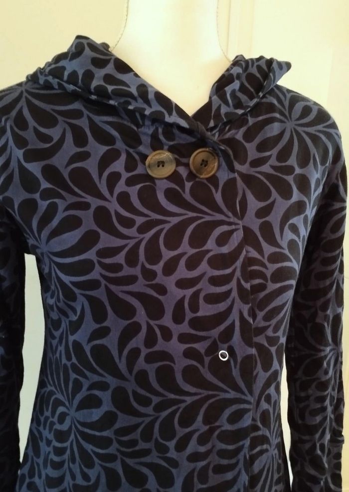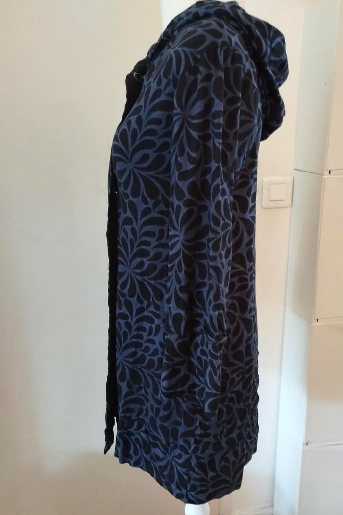 Gilet long de marque Aller Simplement Taille M en textile coton fin doublé coton Coloris bleu foncé, motifs noirs Fermé par 2 gros boutons et un bouton pression Capuche Longueur environ 77 cm