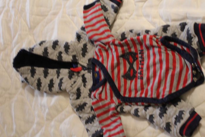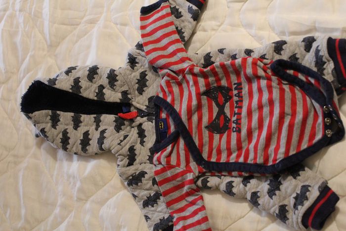 Lot de vêtements naissance 1 mois comprenant 13 bodys manches longues, 3 bodys manches courte, 3 bonnets, ensemble Batman combinaison avec son body manche longue,9 pyjamas, un pantalon et une salopette, 1 veste à capuche, 2tee-shirt manche longue et un gilet 1 paire de chausson en laine