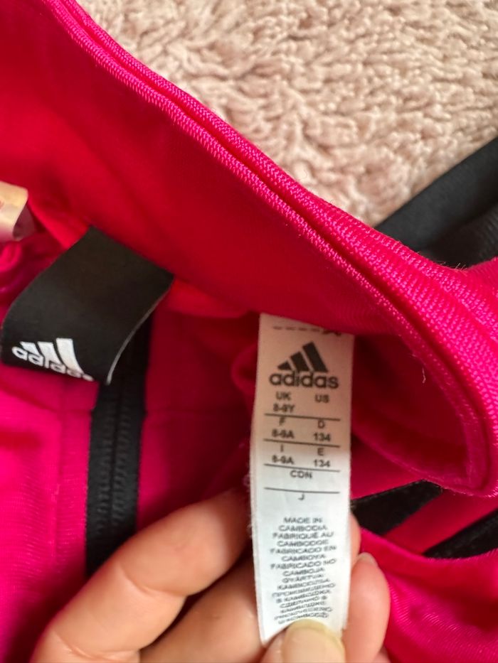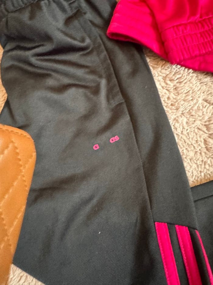 Bonjour Survêtement fille rose et noir adidas En très bon état À signaler le logo sur le pontalon à est effacé regardez la photo s’il vous plaît