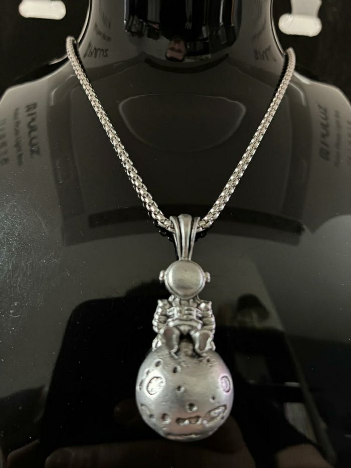 Collier cosmonaute Rigolo Neuf en métal . Chaine longueur 50/60 cm et pendentif 4/5 cm.