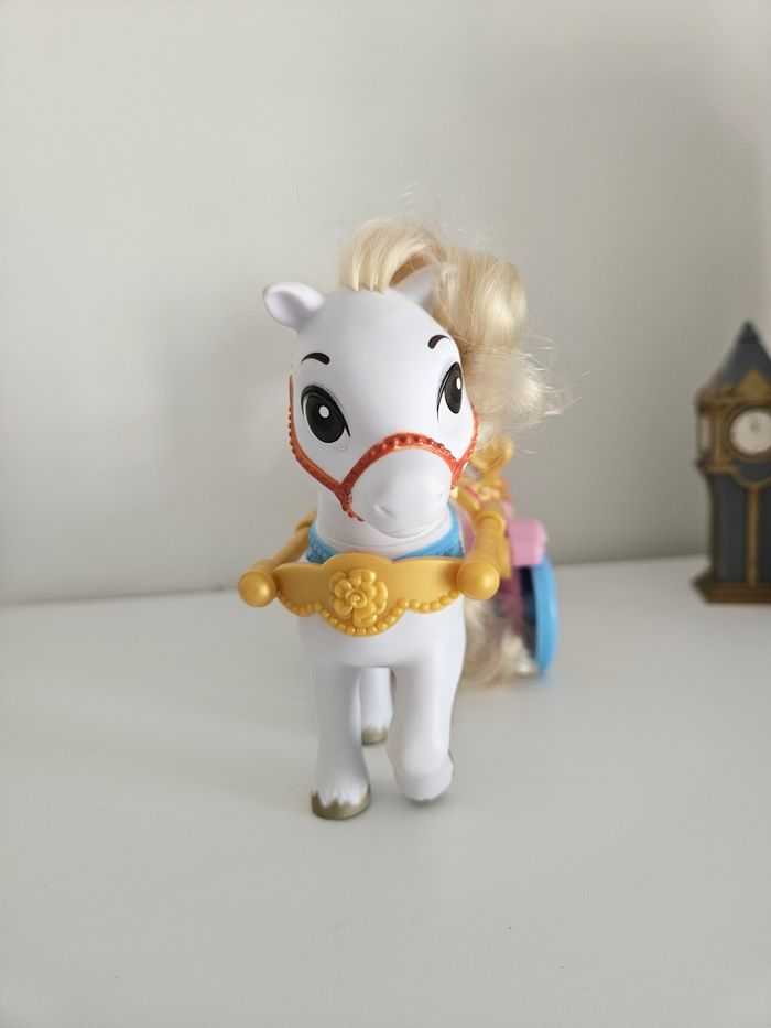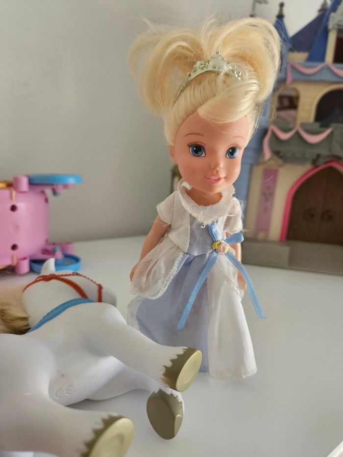 Mini poupée cendrillon et calèche cheval carosse. La calèche est en excellent état avec portes et cheval qui peuvent se retirer . Cendrillon est en bel état également sauf la manche gauche de la robe qui a un accro.