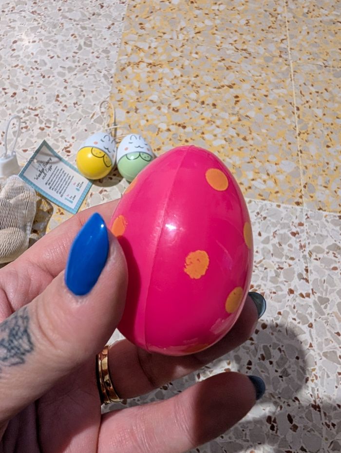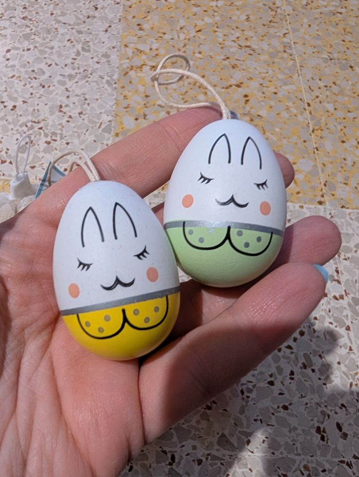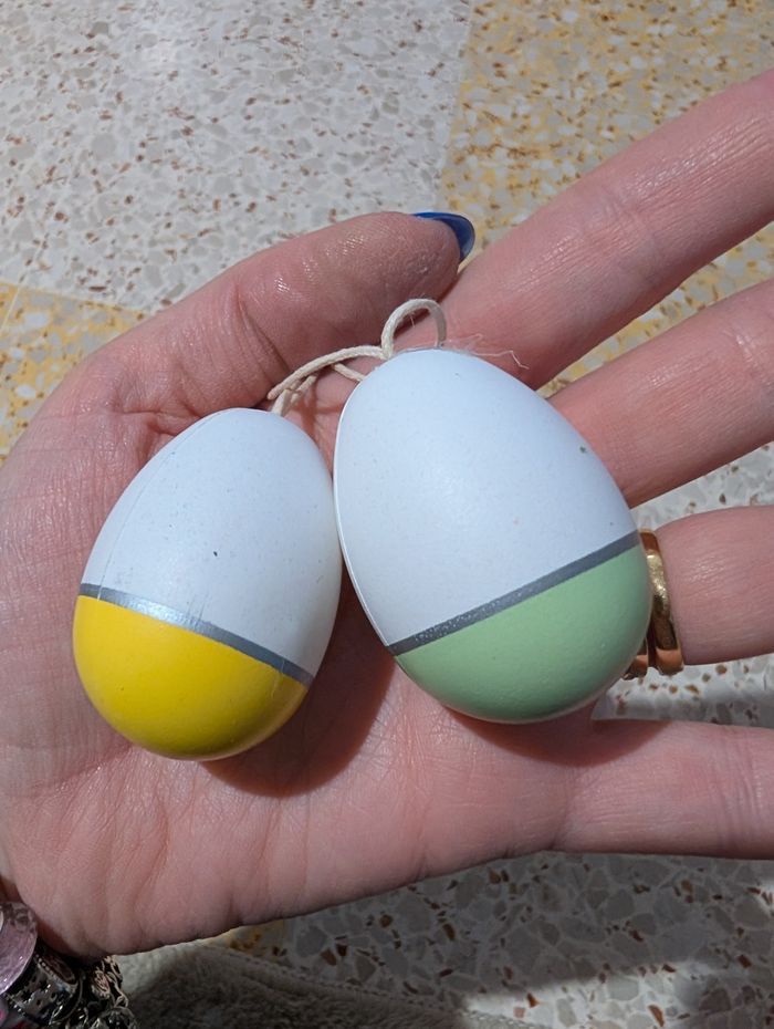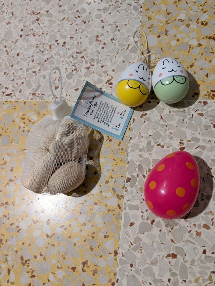 Bonjour Je vends ce lot de deco de Pâques, neuf pour les deco en bois, les deux oeufs a suspendre ont servi une fois et le petit oeuf en plastique servait pour cacher des chocolats dessus :) Voir photos vous achetez ce que vous voyez