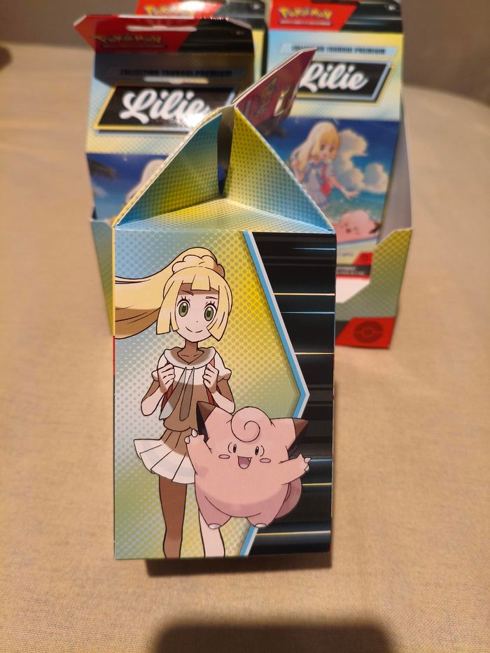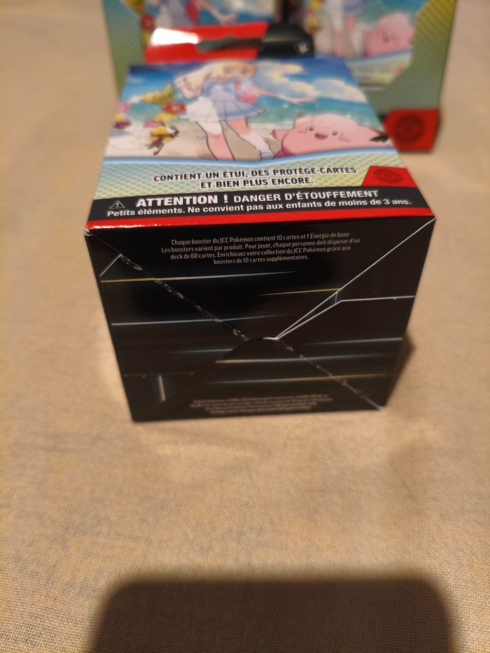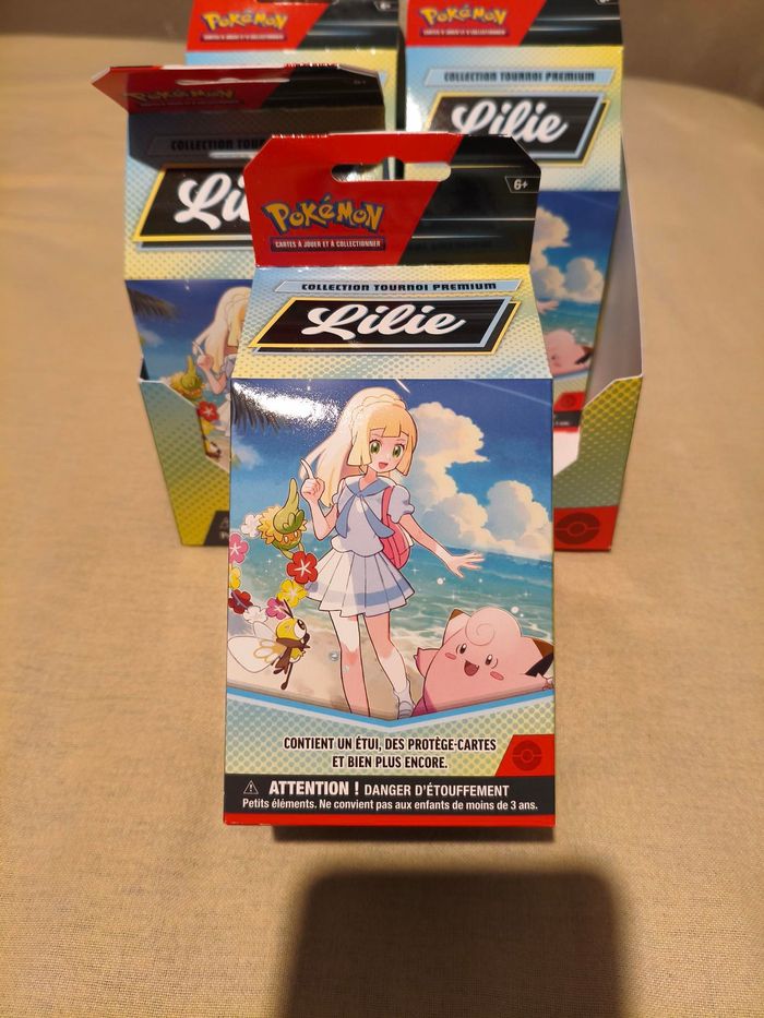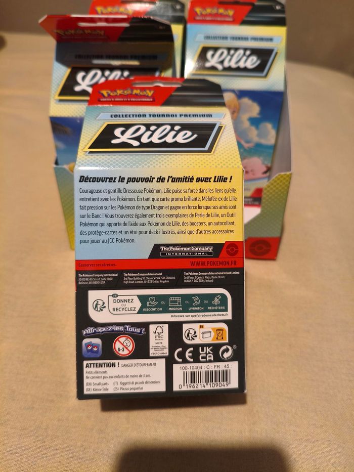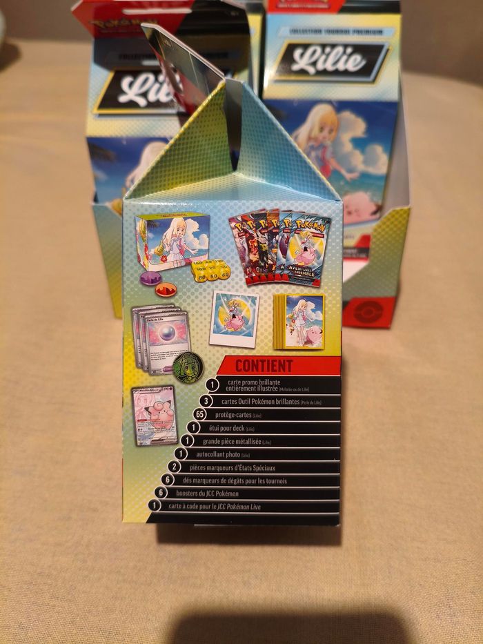 Coffret "brique de lait" collection tournoi lilie neuf scellé français Contient: - Une carte promo exclusive de Lilie, mettant en avant une illustration inédite. - Six boosters Pokémon, permettant d’obtenir des cartes rares et puissantes. - Des accessoires thématiques, incluant des protège-cartes et d’autres éléments essentiels pour le jeu. - Un coffret de rangement pratique et résistant, inspiré des boîtes de stockage utilisées lors des événements compétitifs. Prix ferme Provient de professionnel, Neuf! Non reconditionné, non recollé ou modifié. Préparation et envoi du colis filmé, arnaqueur passez votre chemin. 😊
