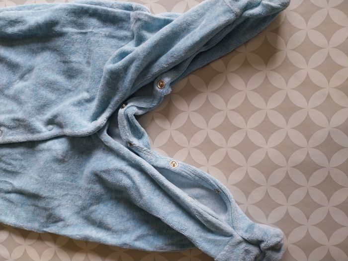Article : Dors-bien / Pyjama une pièce à pieds. Marque : Obaïbi. Taille : 6 mois / 68 cm. Couleur : Bleu ciel chiné. Matière : Velours éponge très doux. Points forts : • Design craquant : Joli motif "ours marin" avec bonnet brodé sur la poitrine. • Pratique : Ouverture par pressions sur le devant (pont asymétrique) et à l'entrejambe pour un change facile. • Qualité Okaïdi : Finitions soignées, tissu qui reste doux lavage après lavage. État : Très bon état. 🏡 Maison non fumeur 🚚 Envoi rapide et soigné. 👉 Possibilité de lot, regrouper les achats pour réduire les frais de port et bénéficiez d’une remise