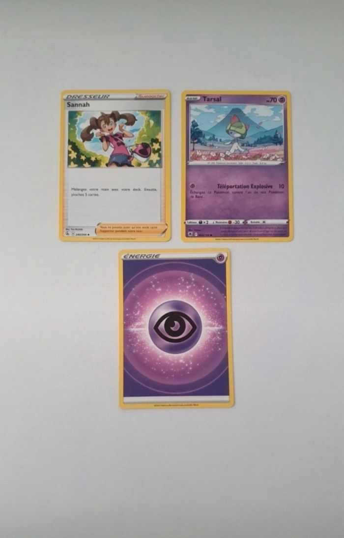 Je vends ce lot de 3 cartes Pokémon neuves. Dresseur Sannah 240/264 Tarsal 060 /189 Carte energie