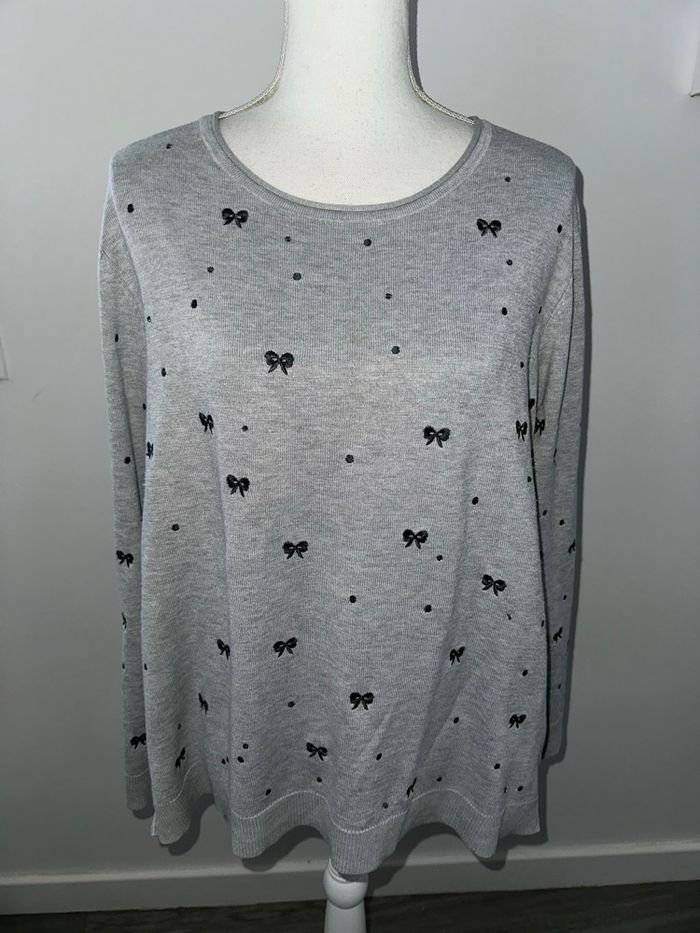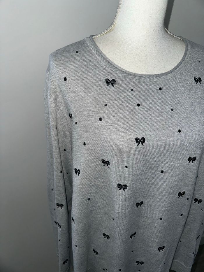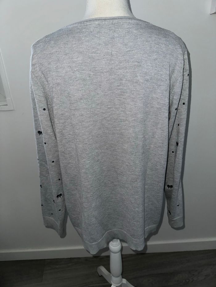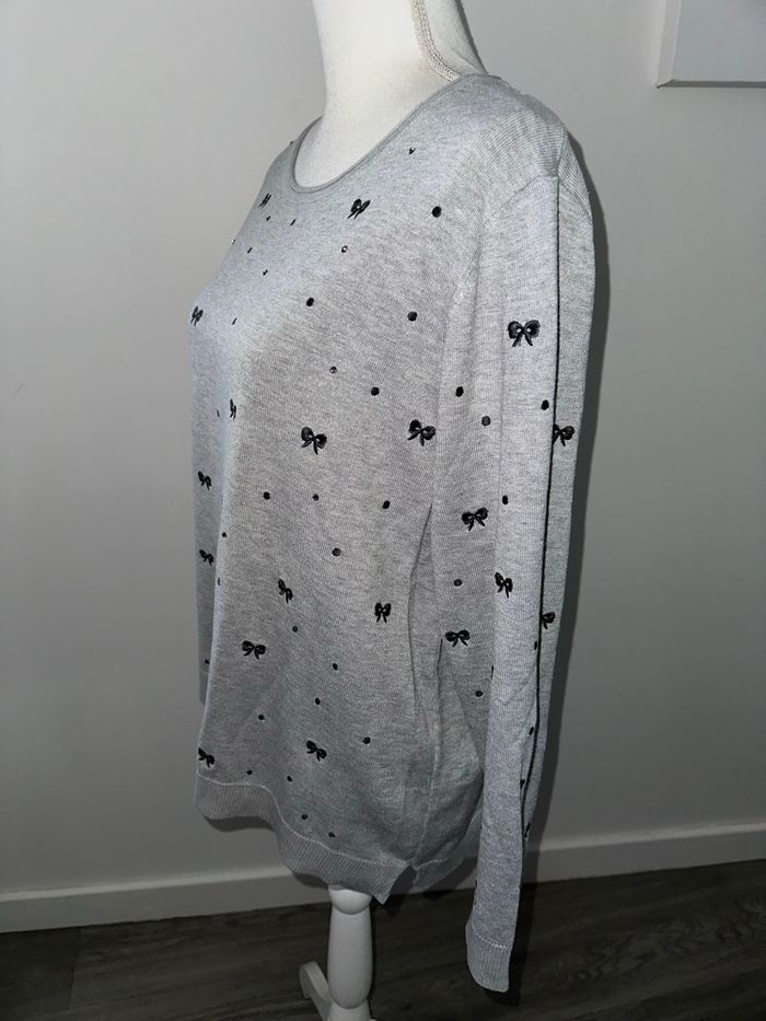 Pull - Excellent état - Taille 42 équivalent XL Dimensions en bas de l’annonce - Gris et noir - Flots noeuds brodés et strass - Pas d’étiquette de matière Dimensions: - 62cm niveau aisselles - 65cm de long