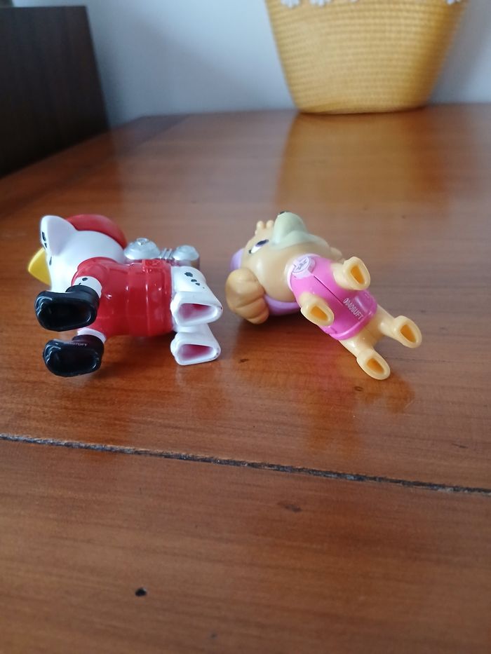 2 figurines en plastique rigide; articulée au niveau de la tête; matériel sur le dos et chapeaux non amovibles. Hauteur figurine rouge & blanc : 5,5 cm // voir photos pour détails. À : légères traces à l'arrière de la tête de la figurine beige. Bien tenir compte de ce paramètre [ pas de retour]