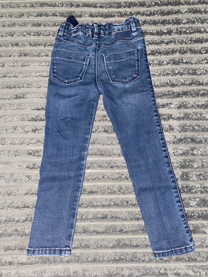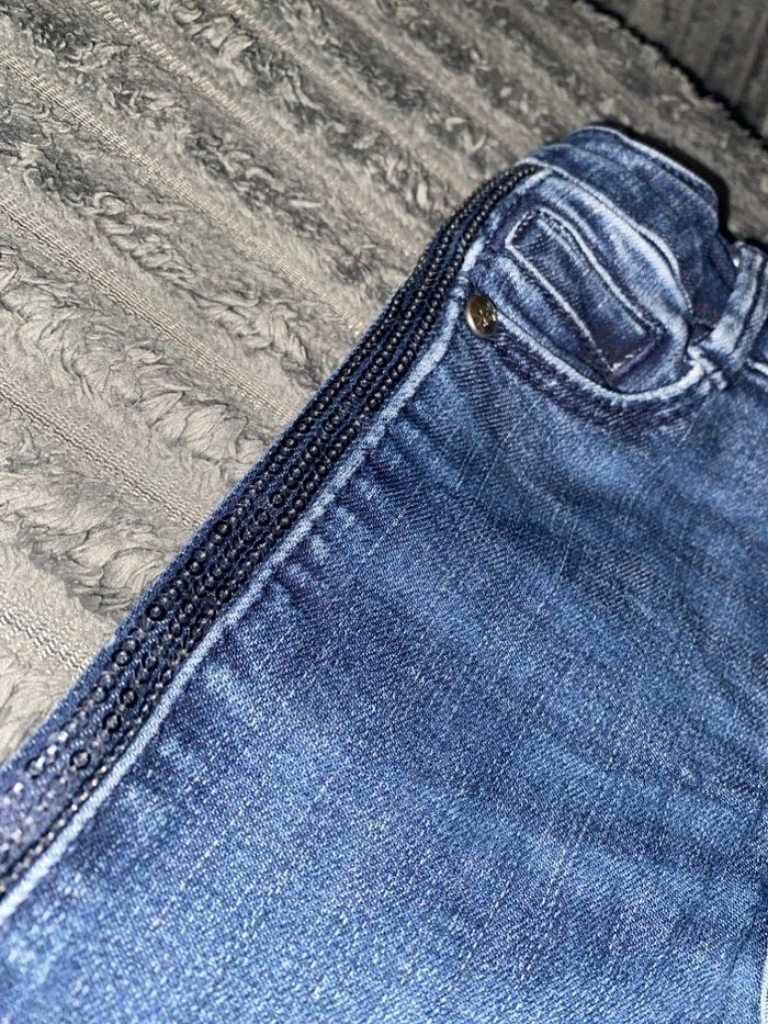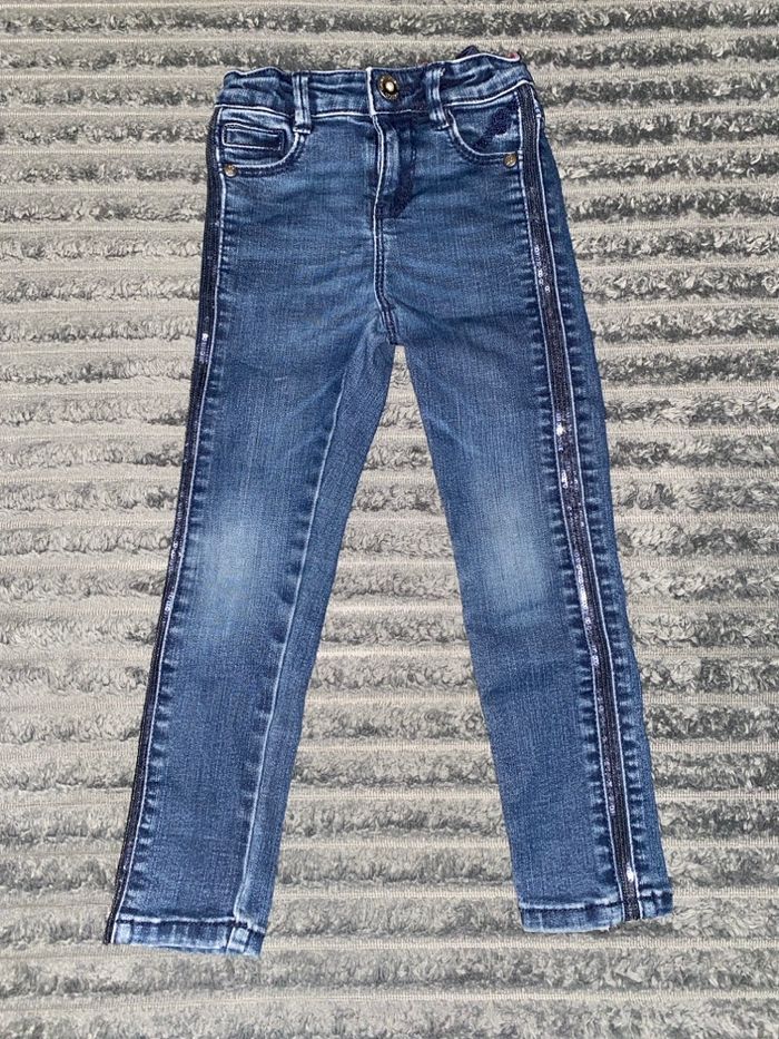 Pantalon fille en bon état. Les strass sur les côtés sont un peu délavée mais ne gêne en rien. Le pantalon en lui même est en tres bon état, juste les genoux un peu délavé. Marque : Okaïdi. Taille: 4ans. 2€.
