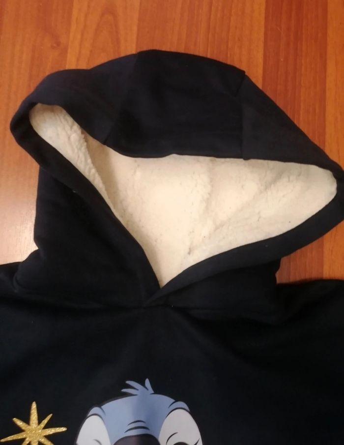 Pull sweat à capuche, bleu marine avec motif Stitch, détails étoiles dorées avec paillettes. Capuche intérieure chaude en moumoutte blanche. Intérieur non moumoutté. Jamais porté, neuf, offert à Noël mais mis en vente suite à une séparation. Les couleurs peuvent différer entre les photos et la couleur réelle du vêtement. #pullstitch10ans #pullstitch10ansfille #stitch10ansfille #sweatstitch10ansfille #sweatstitch10ans