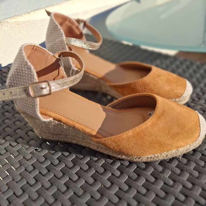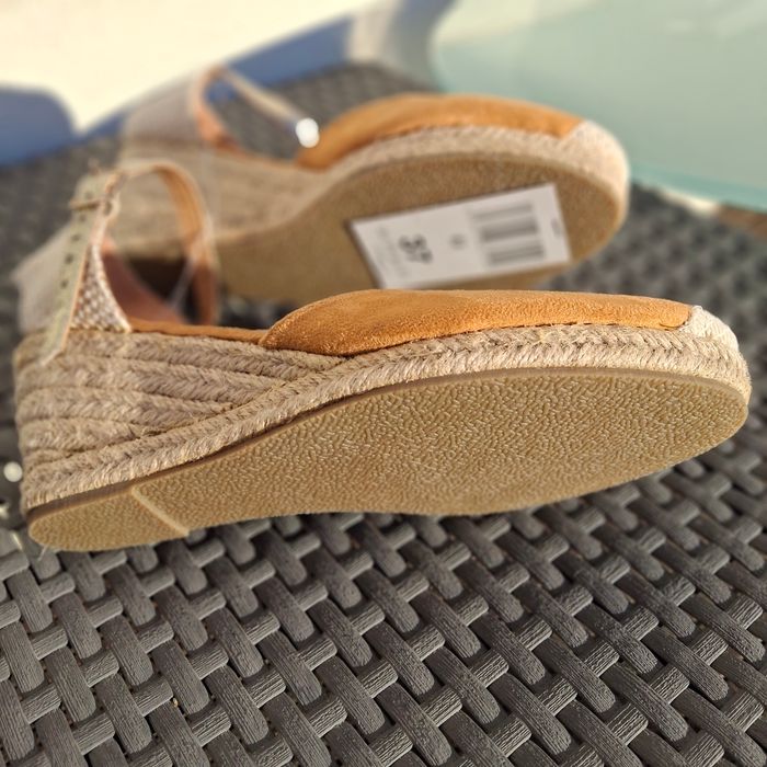 Sandales Compensées en Daim Marron / Camel Neuve avec étiquettes 🏷 Jamais porté Taille 37 Chaussure shoes Confortable Tendances Sandales Espadrille Sandalette L'espadrille compensée est un modèle. Portée pieds nus, elle maintient le pied par une bride. Le talon est entièrement recouvert de corde naturelle. #sandalesneuvesavecetiquette #espadrille #espadrillefemme