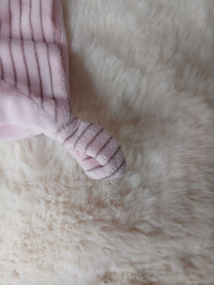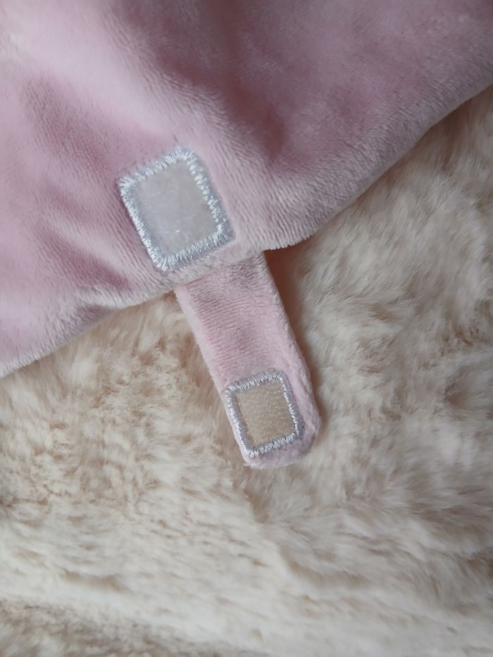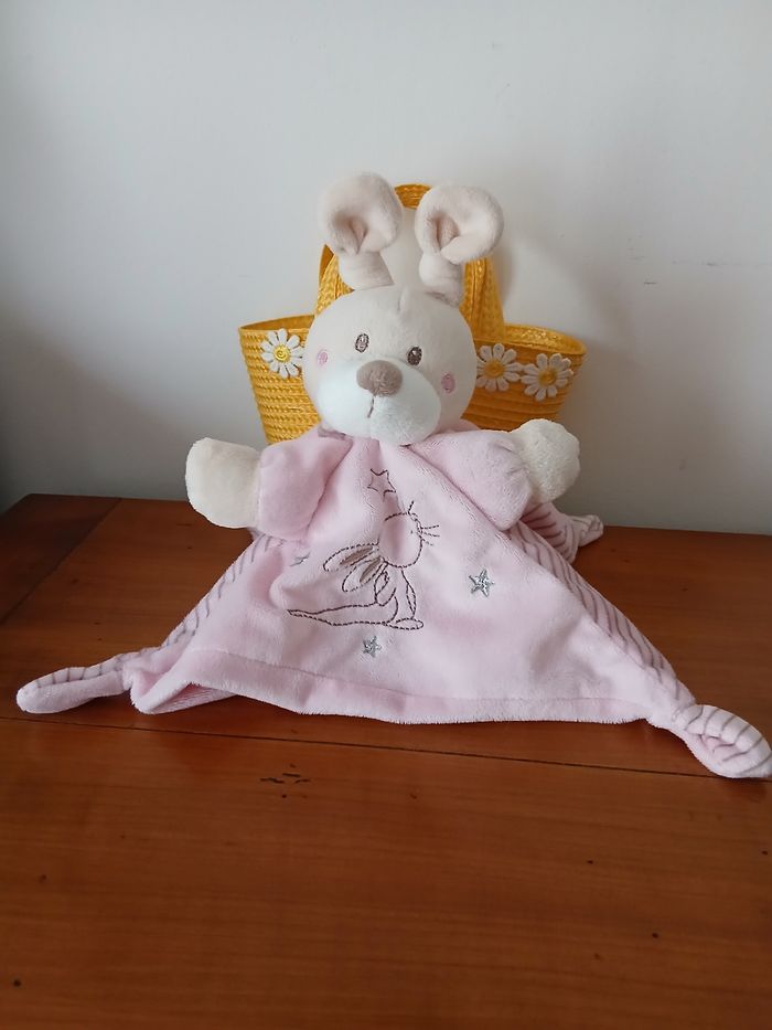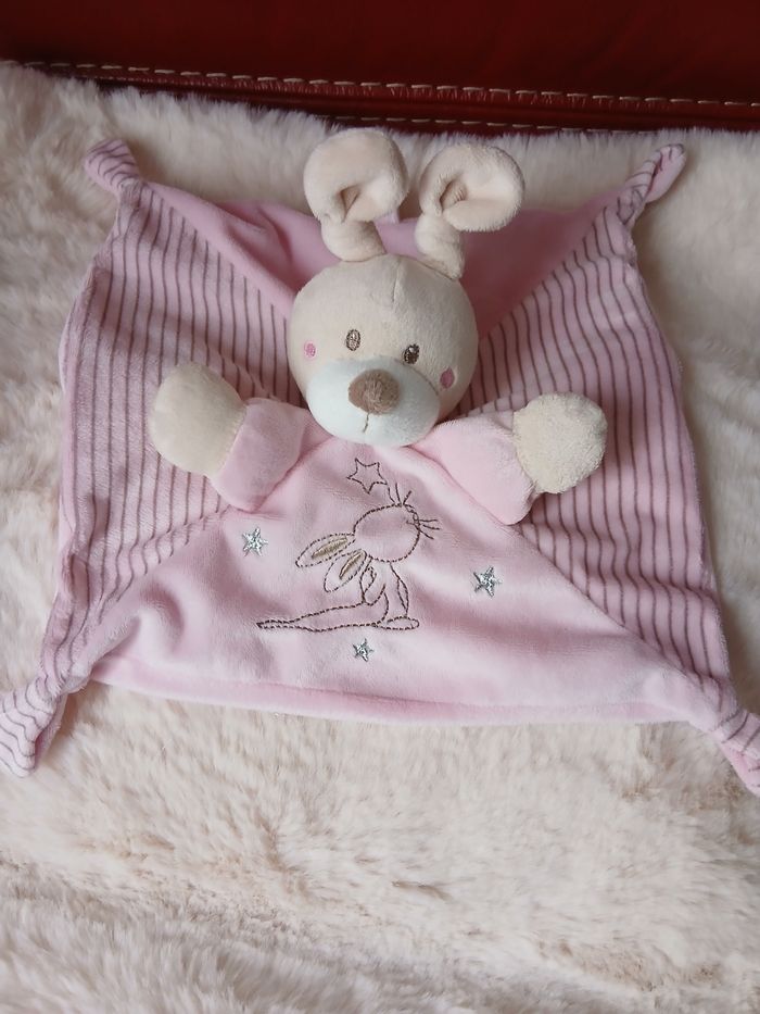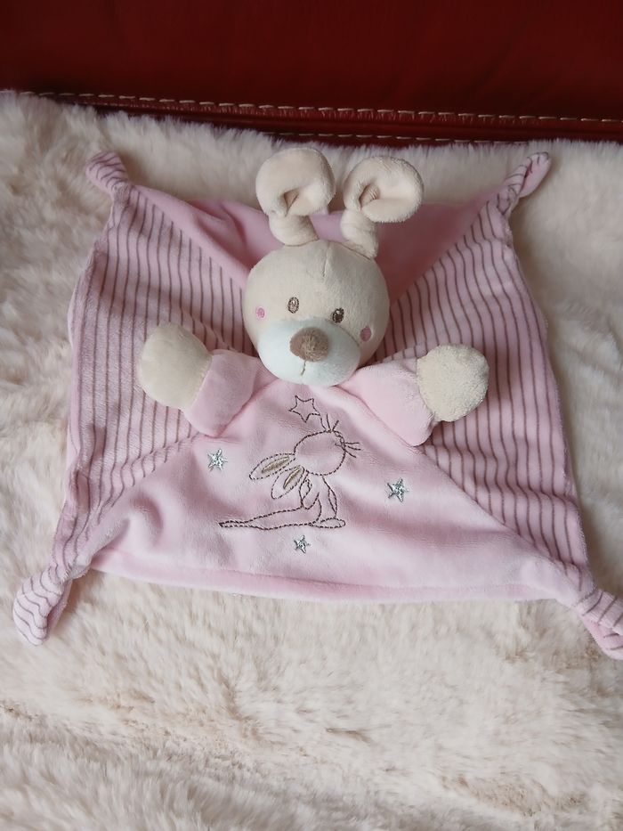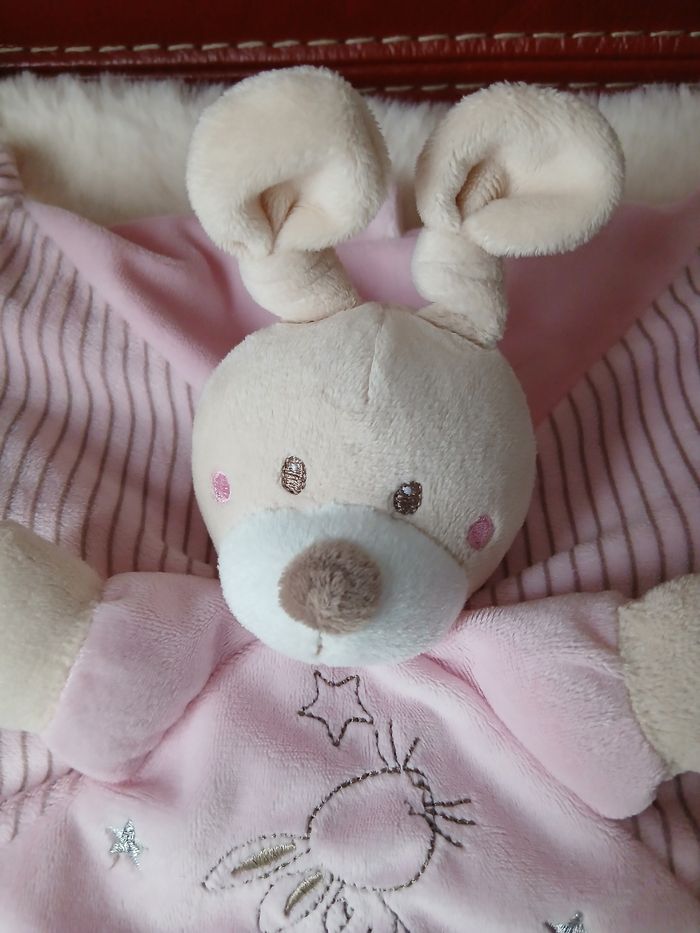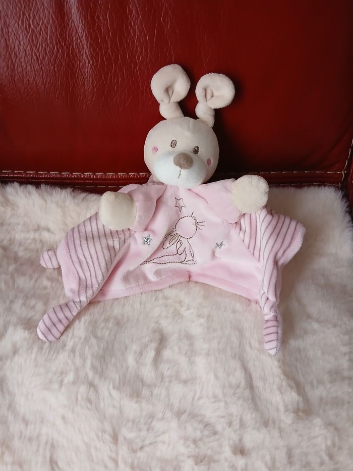 Doudou Lapinou marque Simba. Tête et pattes avant rembourrées; yeux brodés et museau souple; 4 coins à mâchouiller; broderie devant; attache-tétine // voir photos pour détails. À Noter : étiquette coupée
