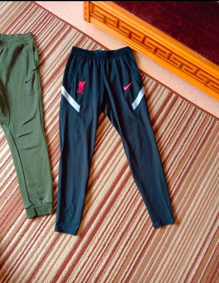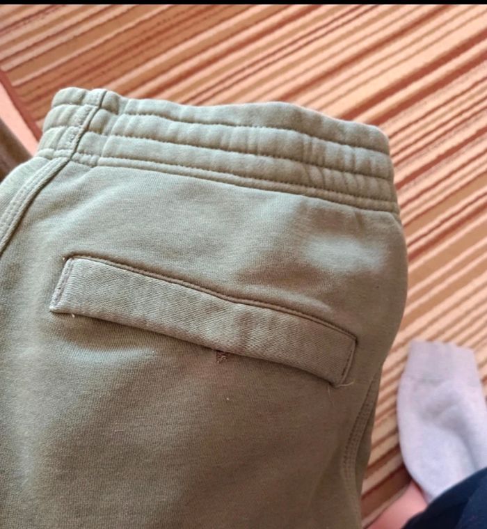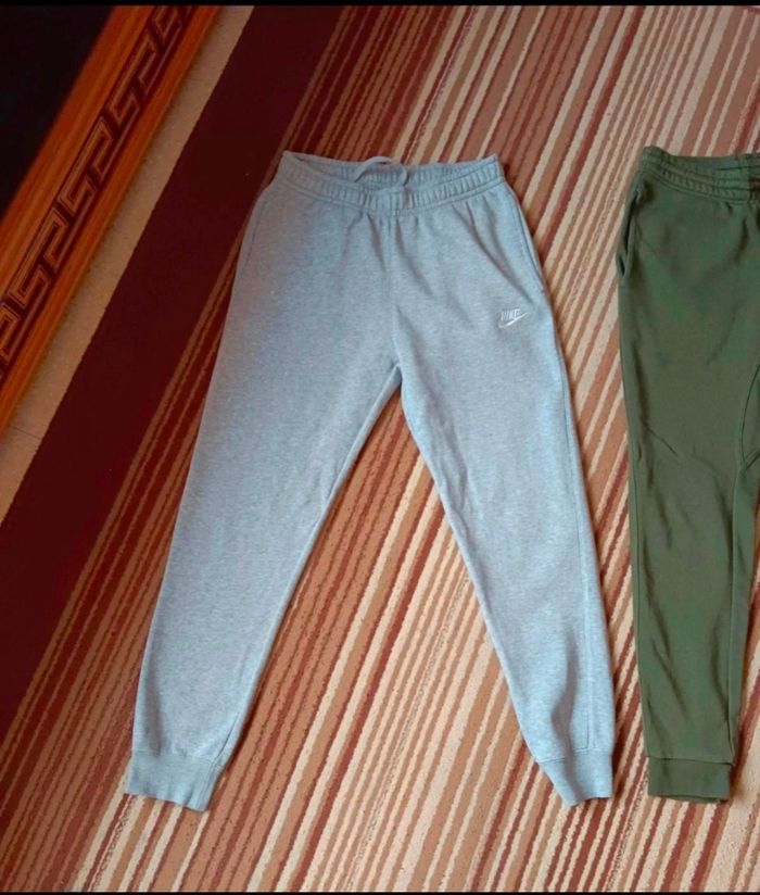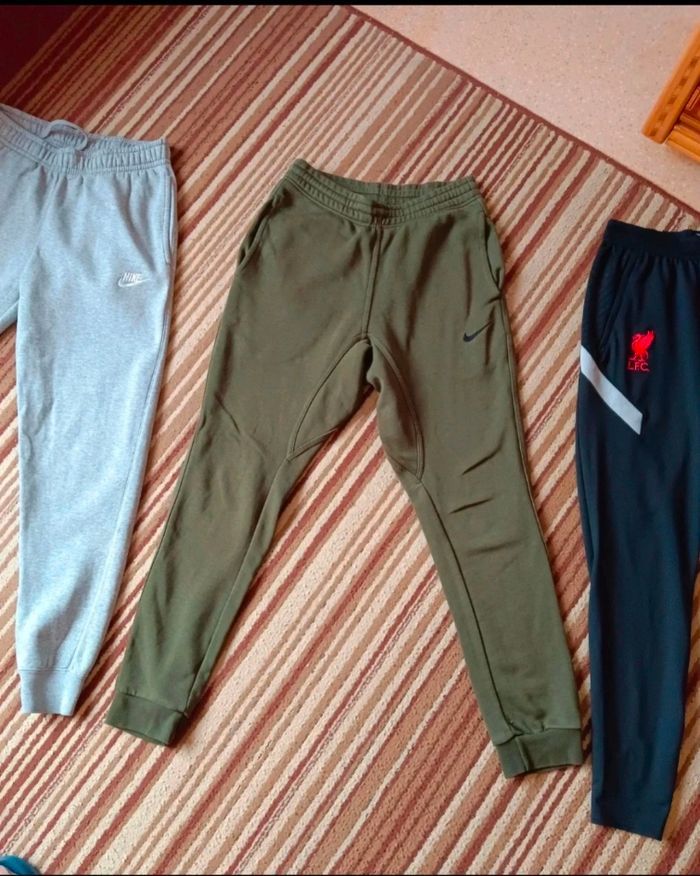Lot de 3 bas Nike. Le gris est en très bon état, il a de très très légères bouloches, c'est vraiment léger mais je préfère le signaler Le vert kaki est en excellent état, mon fils l'a très peu porté, mais à un léger défaut sur le bouton pression de la poche arrière, cela ne se voit pas lorsque le bouton est fermé. Le drif fit est également en très bon état. Les 3 bas sont de taille S.