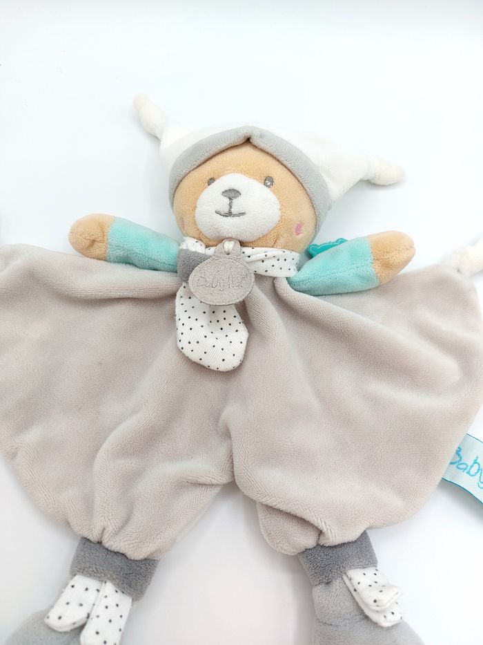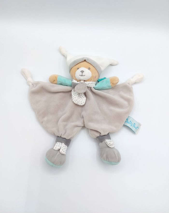 Doudou plat ours Polochon BABY NAT BABYNAT gris blanc vert pois BN0352 Très bon état, lavé - étiquette autour du cou abîmée Envoi rapide 👋 Vendeur professionnel – articles soigneusement sélectionnés, nettoyés et vérifiés avant expédition. A12782 #doudou #ours #bébé #babynat #peluche