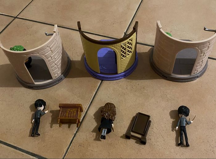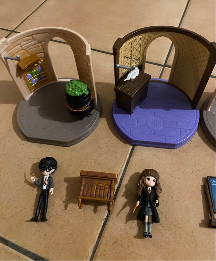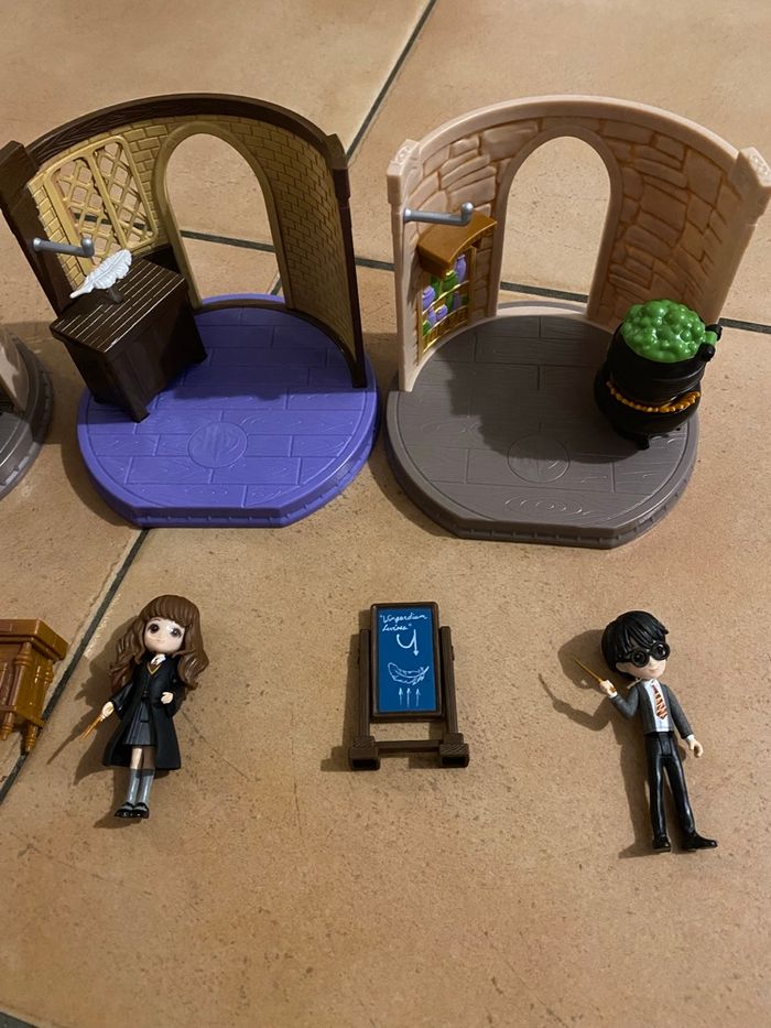 Lot Magical Minis Harry Potter avec : - deux mondes « cours de potion » - un monde « cours de sortilèges » Avec leurs figurines Il manque quelques éléments mais ne gêne en rien l’utilisation. Peuvent s’adapter sur le château Vous achetez ce que vous voyez sur les photos