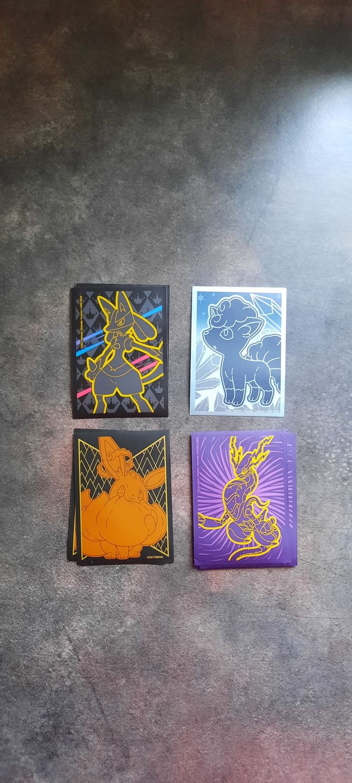 13 sleeves Pokémon neuf lucario x2 goupix x1 evoli x2 sleeve violet x8