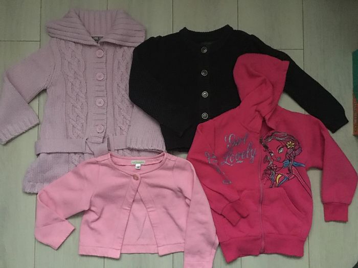 Lot de 4 gilets, 4 ans : - rose pâle avec ceinture et col, Vynil Fraise. Bon état - boléro rose, 1 bouton, Vertbaudet. Il y a un bouton de rechange sur l’étiquette. Bon état - gilet à fermeture éclair, rose fushia. État satisfaisant. - gilet, 2 petites poches avant, gris foncé, Okaïdi. Bon état #aureliem5_vetements4ans
