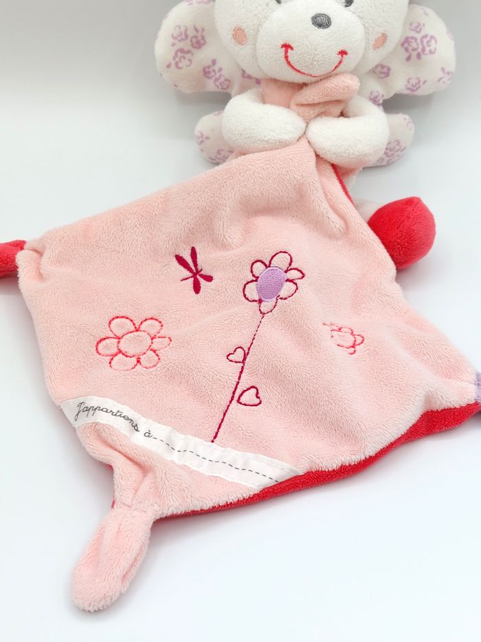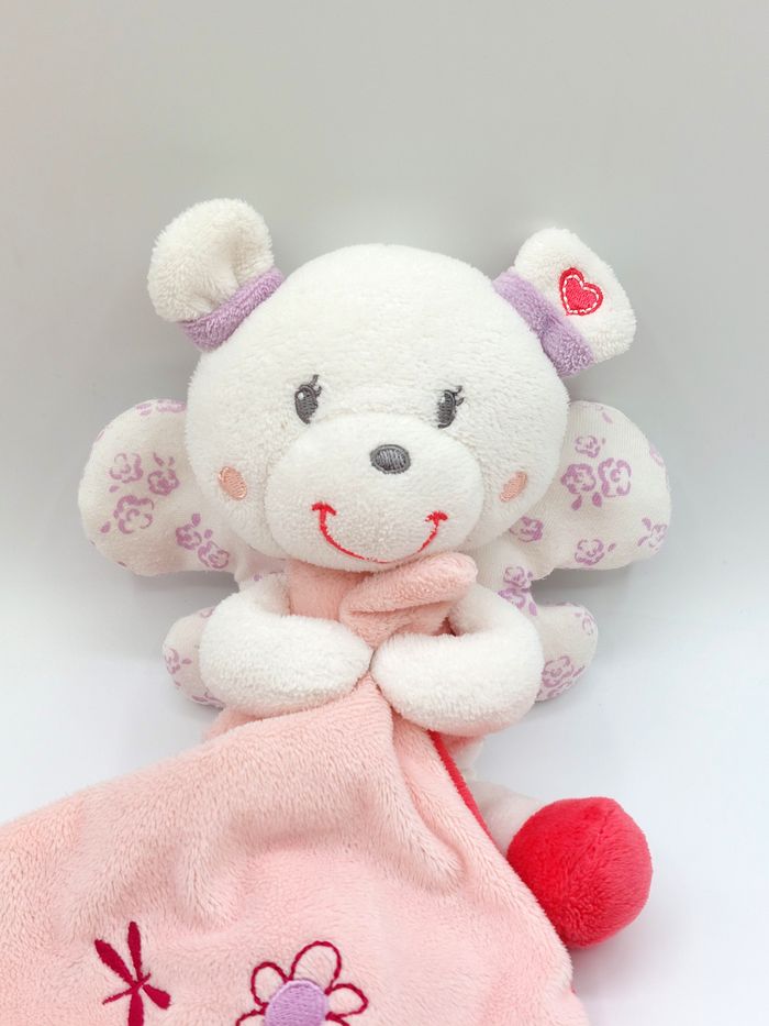 Doudou peluche ours blanc rose POMMETTE mouchoir fleurs j’appartiens à ailes mauve Intermarché