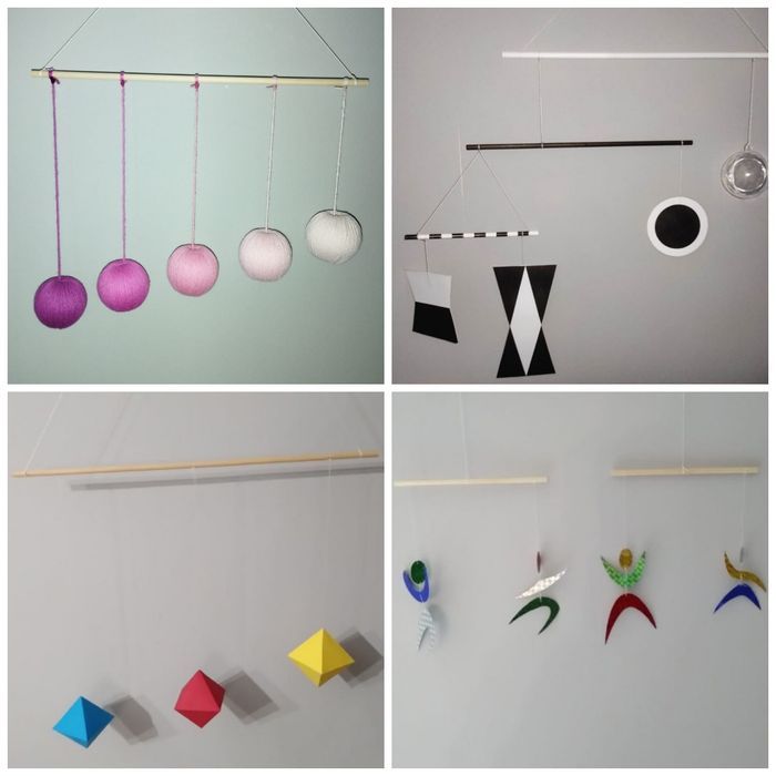 Lot de 4 mobiles inspiration Montessori. Mobiles fait maison vendus montés. Lot comprenant : le mobile de munari, noir et blanc, dès la naissance, possibilité de personnaliser le mobile en écrivant le prénom du bébé dans la boule transparente (le préciser lors de la commande); le mobile des octaedres, dès 6 semaines ; le mobile de gobbi, dès 2-3 mois, dégradé de rose (autres couleurs disponibles, me contacter); le mobile des danseurs, papier holographique multicolore , dès 3-4 mois (autres couleurs disponibles me contacter).