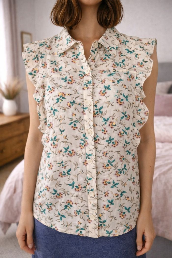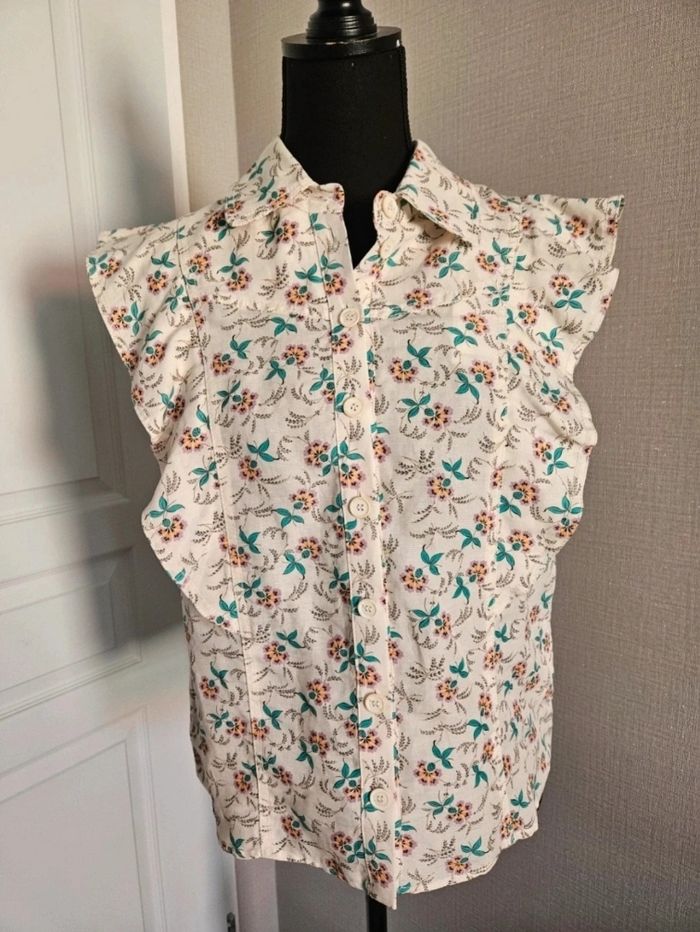 Superbe chemise sans manches / top Capucine de chez Claudie Pierlot imprimé floral en taille 40 De jolis volants sur les côtés Neuve avec étiquette #flagadajonestaille40 #chemisier40 #chemise40 #claudiepierlot #claudiepierlot40 #chemisierclaudiepierlot40 #chemiseclaudiepierlot40