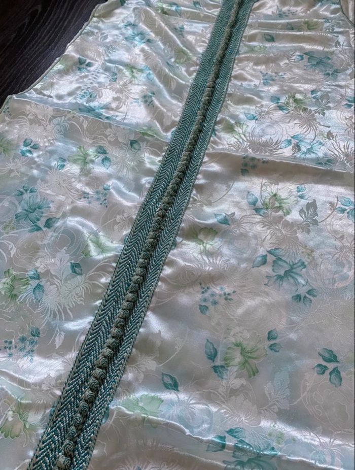 📐convient à 42-46 🎨 Couleurs : bleu avec reflets satinés, motif floral 🌸 ouverture en bas sur les 2 cotés avec couture 📏Aisselle à aisselle 53 cm 📏 Hauteur : 1m27 🧼Très bon état, quasi neuf