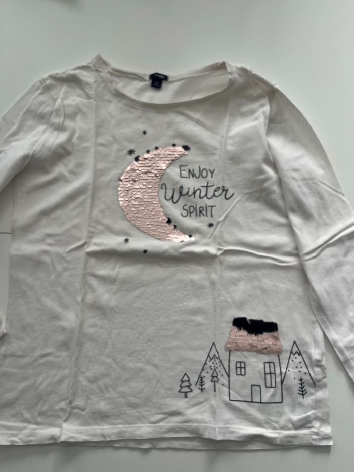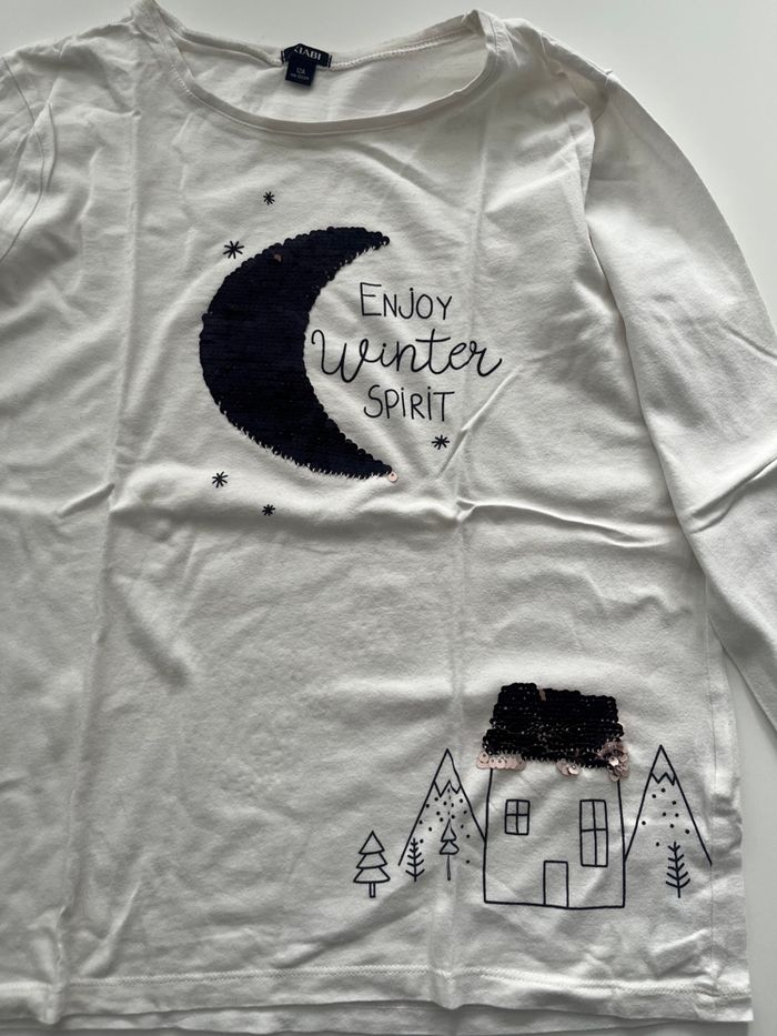 Lot de 3 hauts manches longues pour fille taille 11–12 ans. Comprend : ✔ 1 haut beige clair basique facile à assortir avec perles ✔ 1 haut Kiabi avec lune en sequins réversibles ✔ 1 haut Zara Kids “Enjoy Winter Spirit” avec détails strass et tulle Parfaits pour l’école et le quotidien. 🔹 État : bon état général Petites traces d’usure normales, et légères marques discrètes sur un haut clair (voir photos), rien de très visible porté. Maison non fumeur. Envoi rapide.