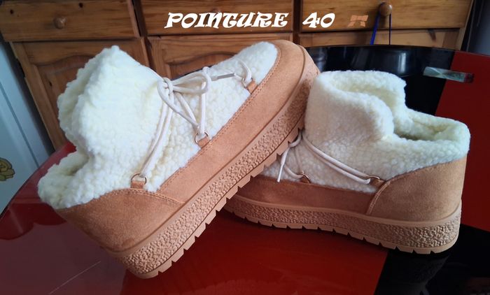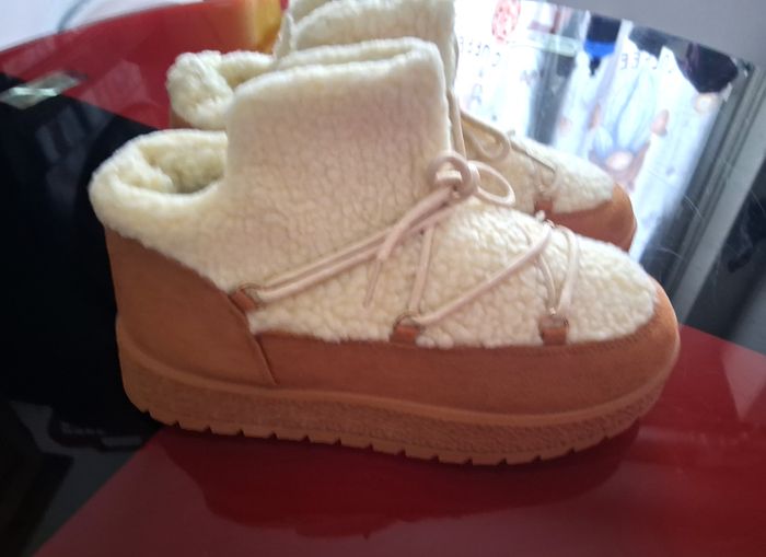 Très jolie paire de boots entièrement fourrés, couleur Camel et blanc, semelle épaisse, se porte avec lacets ou sans, boots neuves, jamais portés, pointure 40,