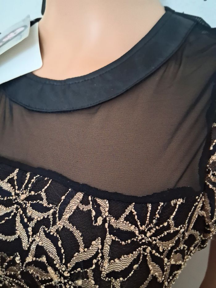 Très jolie robe neuve avec étiquette de couleur or et noir, robe extensible, va de la taille 36 au 40, simili cuir au col, tous le haut est brodée