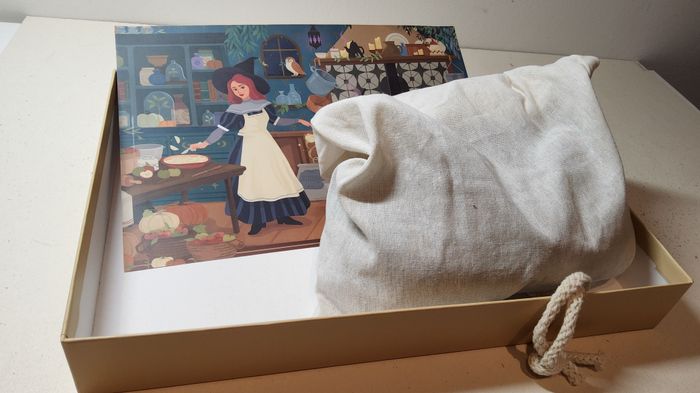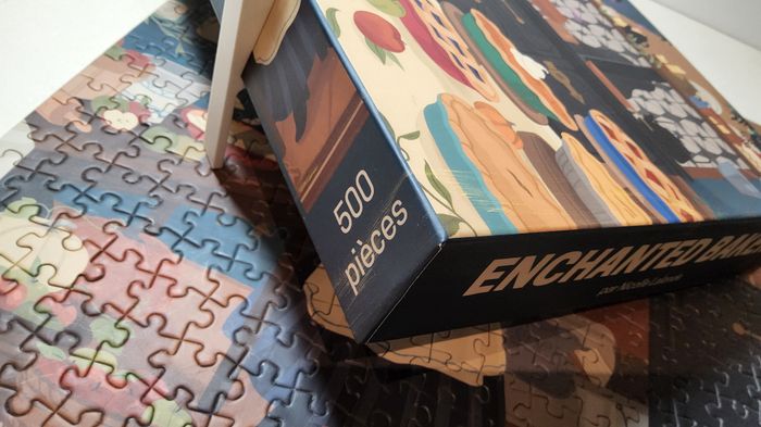Puzzle 500 pièces Trevell « Enchanted Bakery » par Nicolle Lalonde. Complet. La boîte a des rayures jaunes sur un coin, et certaines pièces sont légèrement abîmées (voir photos).