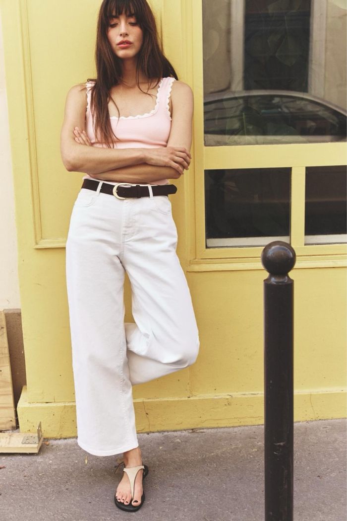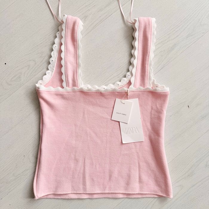 Top Zara stretch perles taille S Top confectionné en tissu type maille. Encolure carrée et larges bretelles. Finitions ondulées avec application de perles. Poitrine : 32 cm Longueur avant : 45 cm Largeur de dos : 32 cm COMPOSITION : 68% viscose 28% polyester recyclé certifié RCS 4% élasthanne
