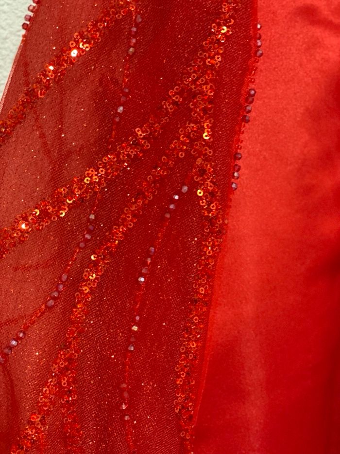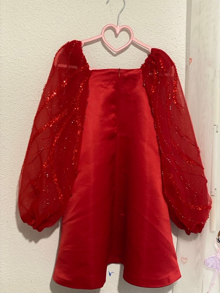 J'ai cousu moi-même cette robe de soirée. Le tissu vient de l'étranger et la taille convient à une fillette de 5 et 6ans.Elle est impeccable, portée seulement deux fois.